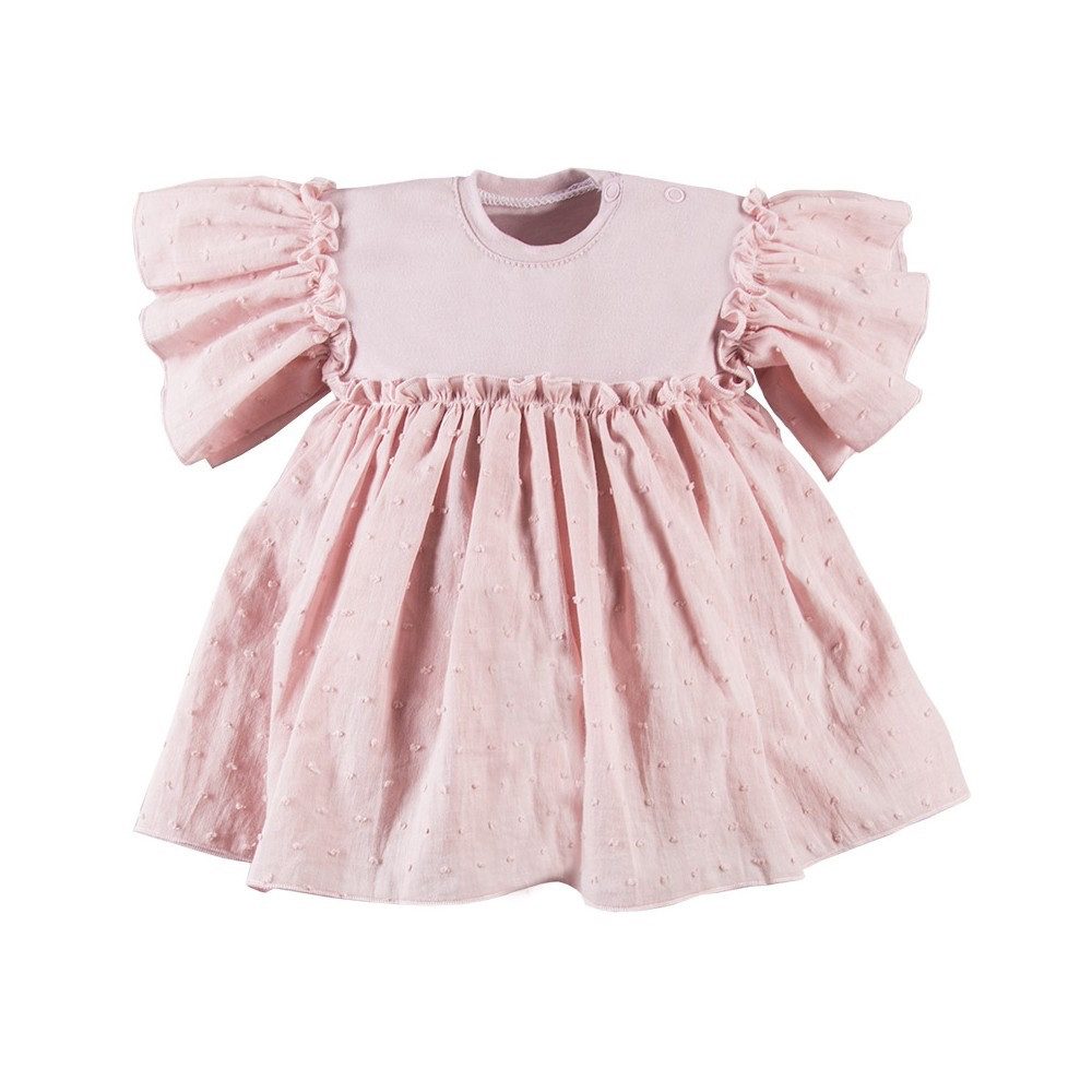 Kleid Swan, hergestellt aus weicher, hochwertiger Baumwolle bietet dieses Kleid ein Trageerlebnis. Die Rüschen aus rosa Baumwollstoff mit hübschen Tupfen sind ein absoluter Blickfang und verleihen dem Kleid eine verspielte Note. Für eine einfache Handhabung und höchsten Komfort hat das Kleid bis einschließlich Размер 80 eine praktische Schulteröffnung. Dies erleichtert das An- und Ausziehen und bietet gleichzeitig eine bequeme Passform. Der weite Schnitt des Kleides sorgt dafür, dass es luftig und angenehm zu tragen ist. Das Kleid Swan besteht zu 100 % aus hochwertiger Baumwolle, was nicht nur für einen angenehmen Tragekomfort, sondern auch für Atmungsaktivität und Langlebigkeit sorgt.