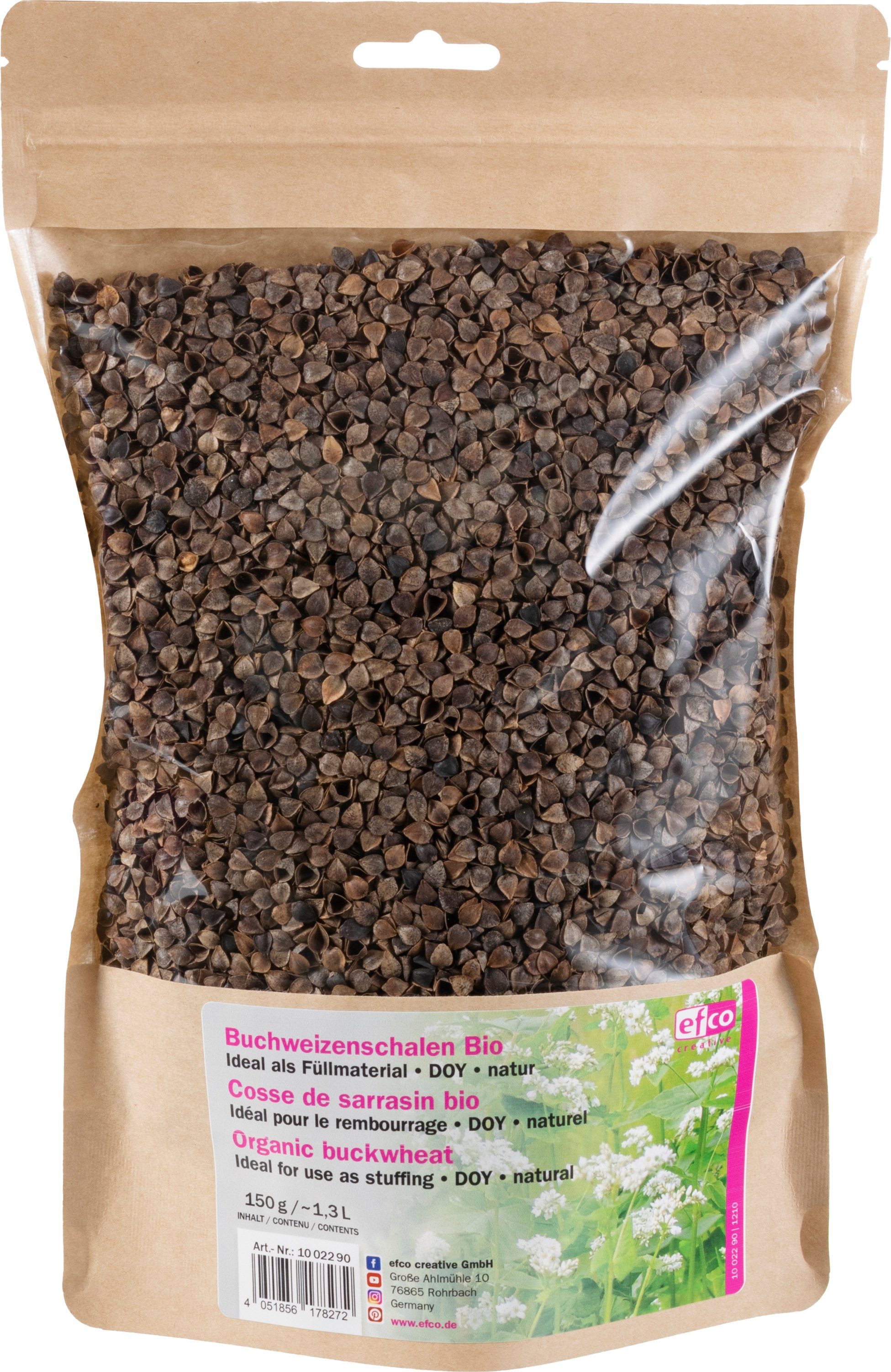 Bio-Buchweizenschalen, 150 g (ca. 1,3 l) als Füllmaterial für selbstgenähte Duftsäckchen, Kuscheltiere, Deko- und Sitzkissen. Dank des Fließverhaltens wirken die Buchweizenschalen als optimale Stütze in jeder Position. Das atmungsaktive Naturmaterial sorgt für einen guten Feuchtigkeitsaustausch und wirkt temperaturausgleichend.