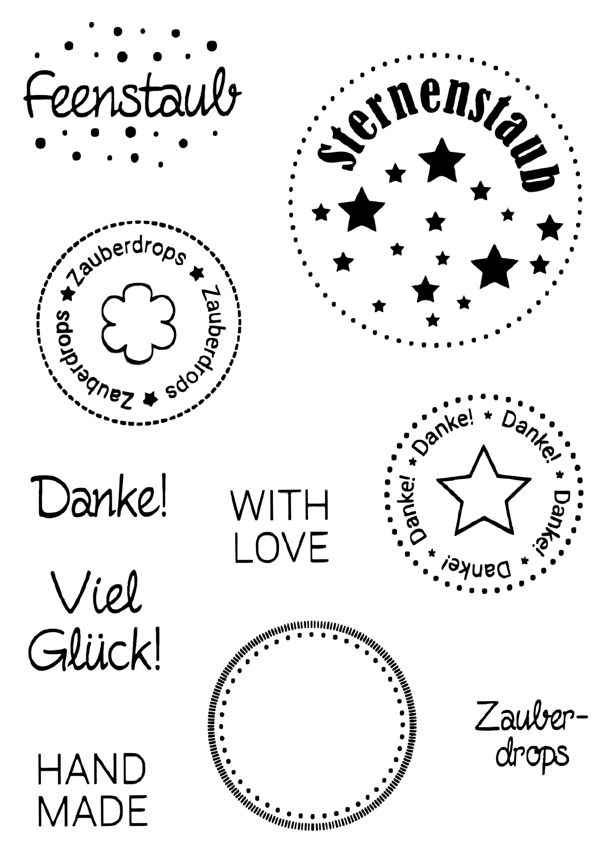 Schönes Clear Stempel-Set 'Zauberdrops' mit 10 verschiedenen Stempeln. Die Clear Stamps eignen sich ideal für das Verzieren von verschiedenen Materialen wie Stoff, Papier, Pappe oder Folie. Die Sprüche eignen sich hervorragend zum Gestalten von Anhänger und Etiketten. Material: Silikon
