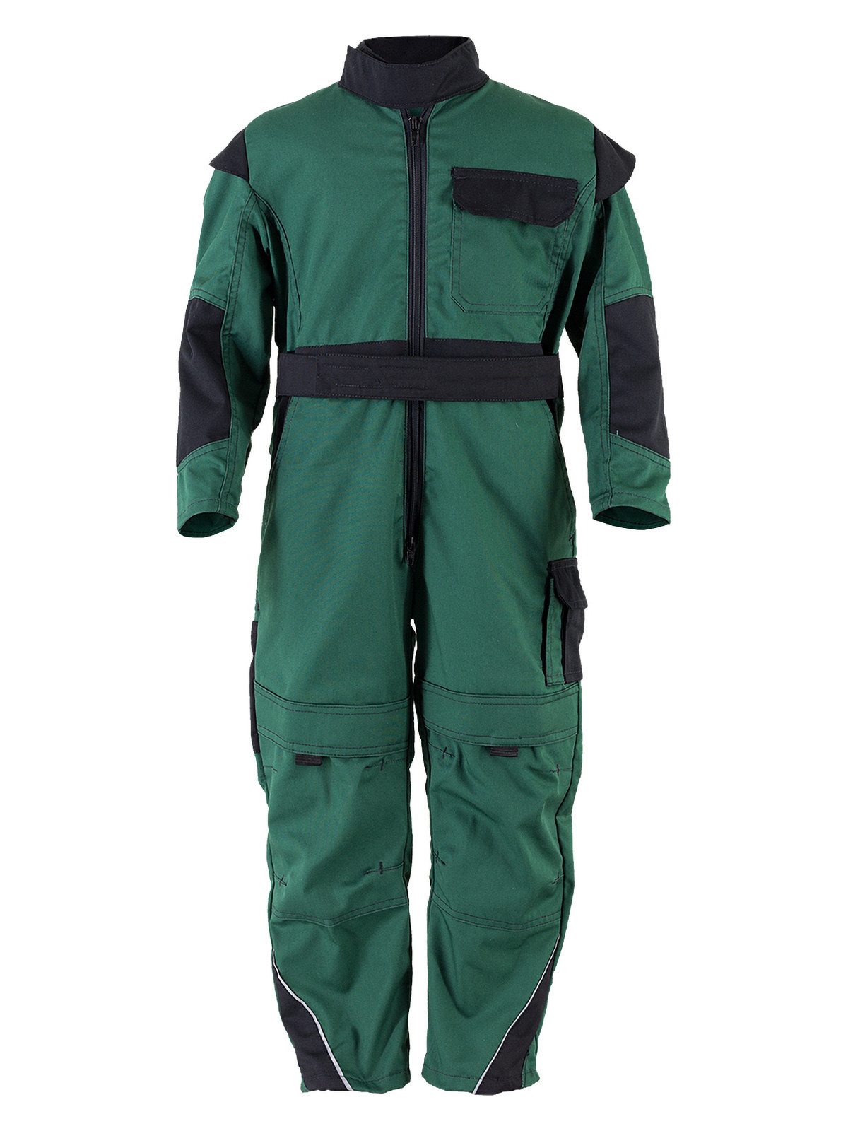 Material: Mischgewebe, Ausführung: durchgehender RV (zwei Wege) sichtbar, 2 Seitentaschen, 1 Gesäßtasche, 1 Zollstocktasche, 2 Brusttaschen, Schenkeltasche und Reflexecken, Farbe: grü