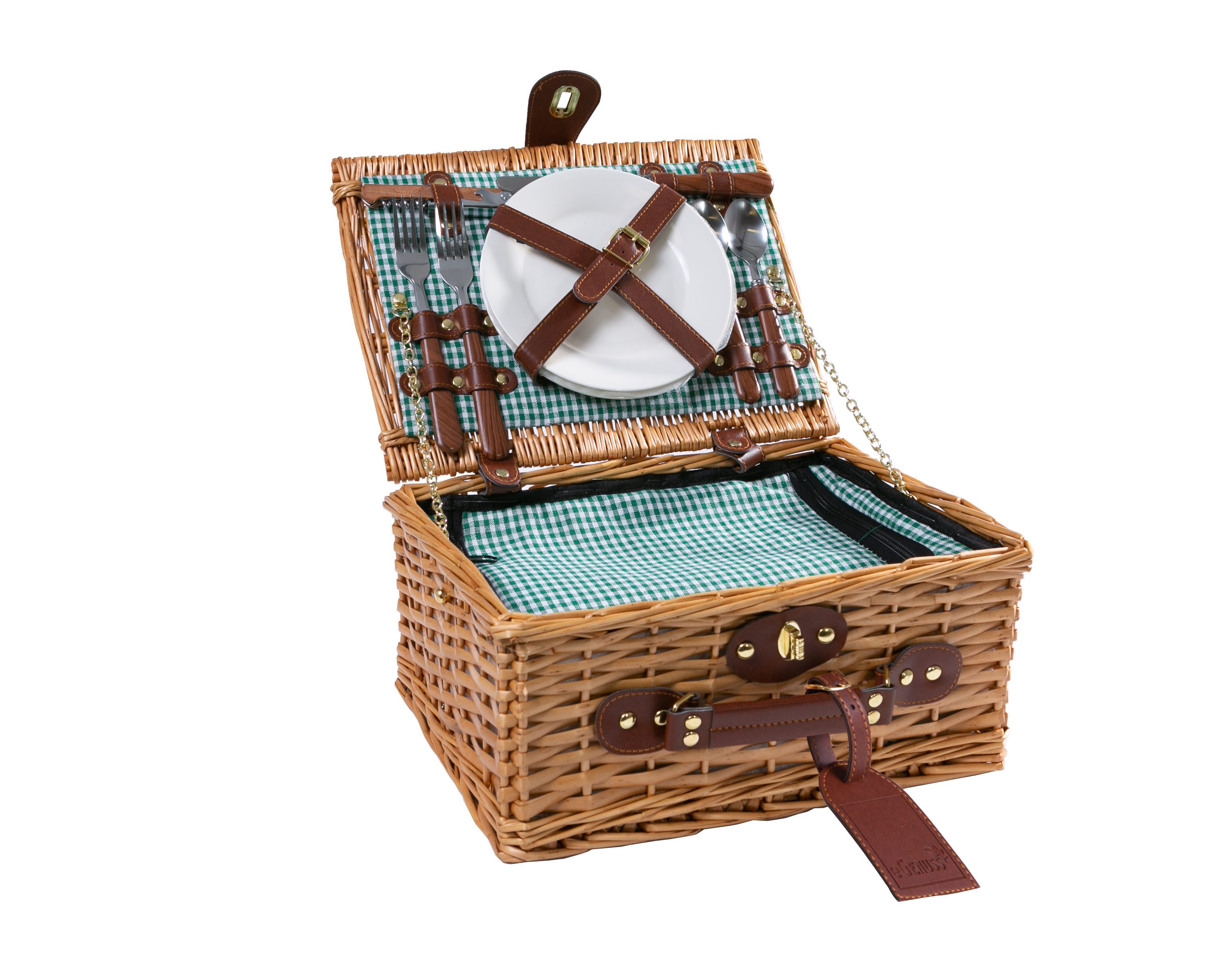 Der Picknickkorb für 2 oder 4 Personen, je nach gewähltem Modell, ist aus natürlicher Weide handgeflochten. Kompakt und leicht zu transportieren.