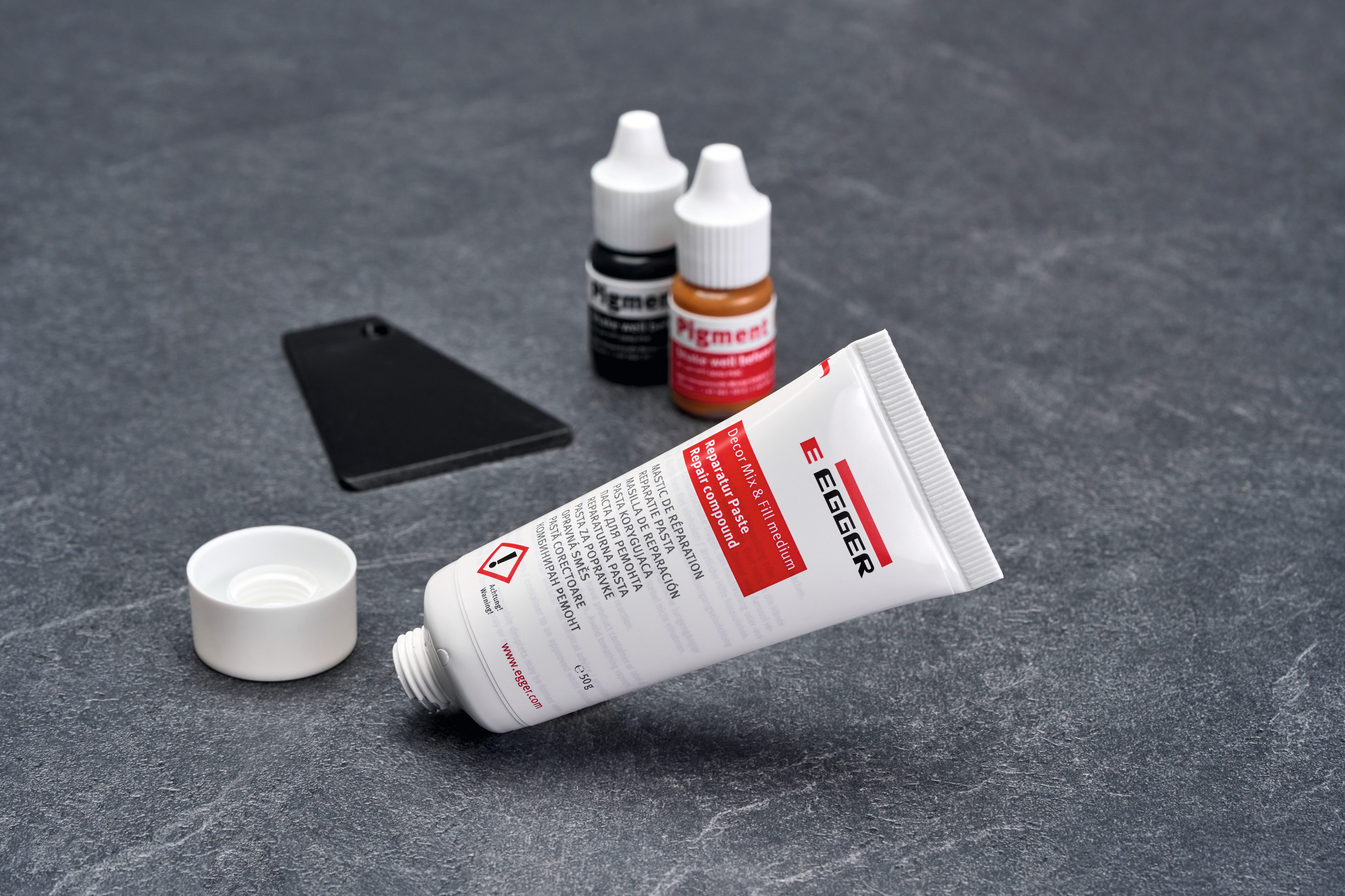 Lieferumfang | 1 Tube 50 g mit heller Paste, 2 Flaschen Farbpigmente a' 5 ml, 1 Spachtel, Farbschablone |