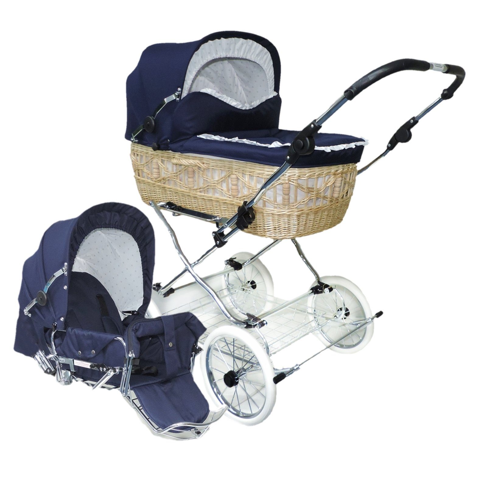 Klassisches Kinderwagen-Set mit handgeflochtenem Weidenkorbaufsatz (made in Germany) und Sportwageneinsatz