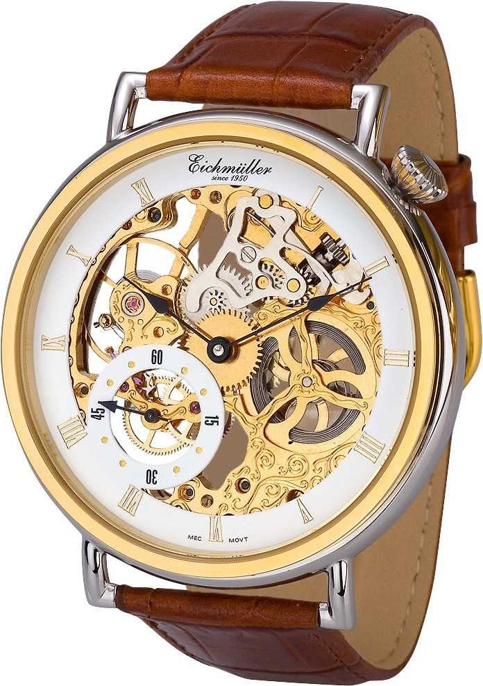 Diese mechanische Herrenuhr überzeugt durch ihr modisches und zugleich elegantes Design. Dazu verleiht das fast komplett skelettierte Zifferblatt dem eleganten Look der Uhr den letzten Schliff. Lediglich der schmale weiße Rand mit den römischen Stunden-Ziffern ist noch zu sehen. Des Впередen befindet sich ein dezentral eingelassenes Sekundenzifferblatt bei “8 Uhr“. Das Gehäuse ist aus hochwertigem, massivem Edelstahl hergestellt und bicolor teilvergoldet. Auf der Rückseite der Uhr ist ein Glasboden, so dass man das Uhrwerk auch von dieser Seite arbeiten sehen kann. Das Echtlederarmband mit Krokoprägung gewährt einen angenehmen Tragekomfort und kann mit einer Dornschließe sicher verschlossen werden. Der angegebene Prüfdruck (Wasserdichtigkeit) beträgt 5 ATM, und sichert eine gute Alltagstauglichkeit.