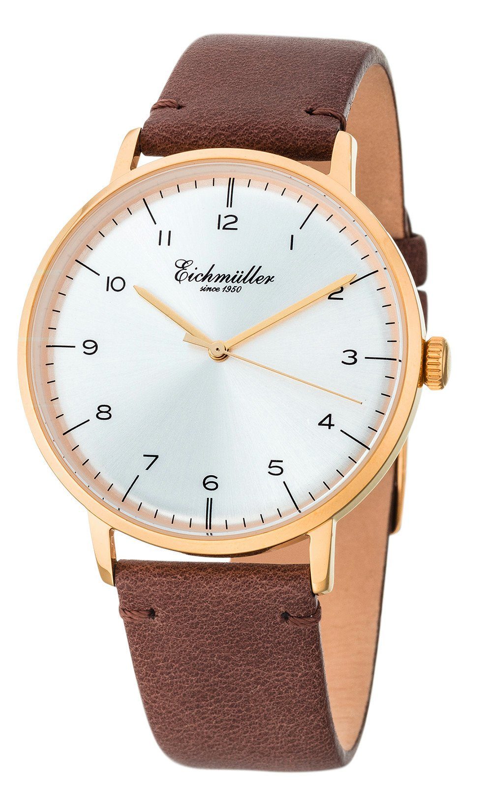Diese Armbanduhr von Eichmüller überzeugt durch ein minimalistisches Design kombiniert mit modernster Technik. Das Gehäuse ist poliert und aus 304 Edelstahl (mit hochwertiger IP-Beschichtung) gefertigt. Im Inneren der Uhr arbeitet ein präzises Quarzuhrwerk aus dem Hause Miyota, Kaliber 2036. Das leicht gewölbte Zifferblatt ist schlicht gehalten mit gut erkennbaren Zeigern und arabischen Zahlen. Das glatte und weiche Echtlederband mit Dornschließe bietet einen angenehmen Tragekomfort.
