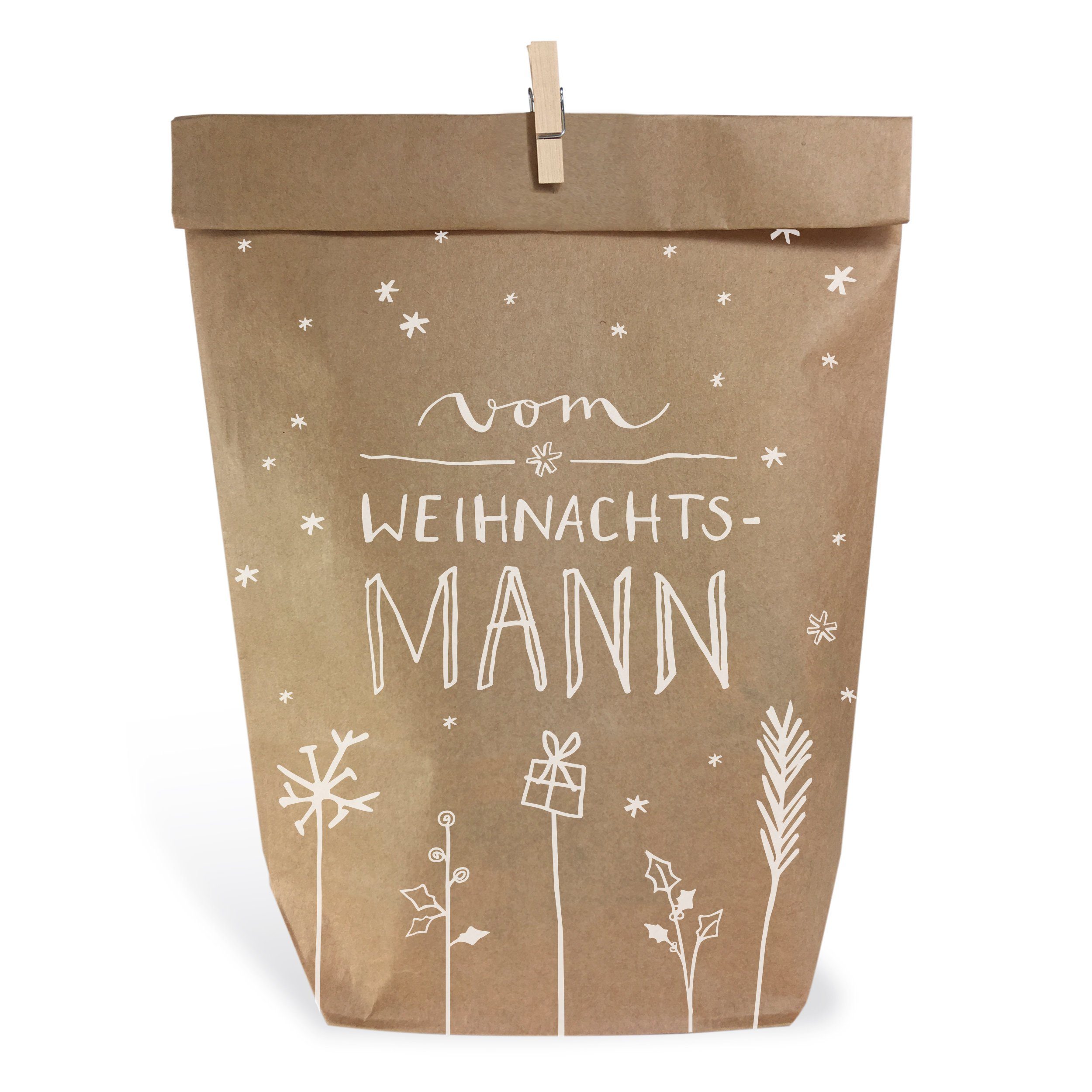 Kleine Geschenke für schöne Weihnachtsfeiern. Und wenn eure kleinen Geschenke, Gastgeschenke und Mitgebsel auch noch so schön verpackt sind, kann da wohl nichts mehr schief gehen ;-) Mit diesen charmant gestalteten Geschenktüten aus Kraftpapier mit weißer Schreibschrift "vom Weihnachtsmann" und dezenter Blumen Illustration erobert ihr die Herzen eurer Gäste im Sturm. Dank der Kraftpapiertüten (und natürlich einem leckeren - am besten süßen - Inhalt ;-) legt ihr bei jeder Weihnachtsfeier einen schönen Start hin. Viel Platz für süße Sachen Euer Geschenktüten-Set besteht aus 24 braunen Kraftpapiertüten (16,5 cm x 26 cm) mit weißem Aufdruck - "vom Weihnachtsmann" und einer hübschen Blumen Illustration im charmanten Handlettering Design und 24 Miniklammern aus Holz. Wie es sich für Kraftpapier gehört, sind die Tüten schön stabil und können auch mit schwereren Geschenken (z.B. selbstgemachte Marmelade) gefüllt werden. Die Tüten haben einen 6,5 x 10 cm Kreuzboden und können bei entsprechender Füllung stehen. Ansonsten eignen sich die Tüten natürlich auch für kleine Bücher (bis A5), Süßigkeiten, selbstgebackene Plätzchen, Schokolade, Pralinen und vieles mehr. Verschließen könnt Ihr die Geschenktüten ganz einfach mit den mitgelieferten Mini Holzklammern. HINWEIS: Für die Aufbewahrung unverpackter Plätzchen und Lebensmittel sind die Tüten nicht geeignet, da sie nicht fettabweisend sind.