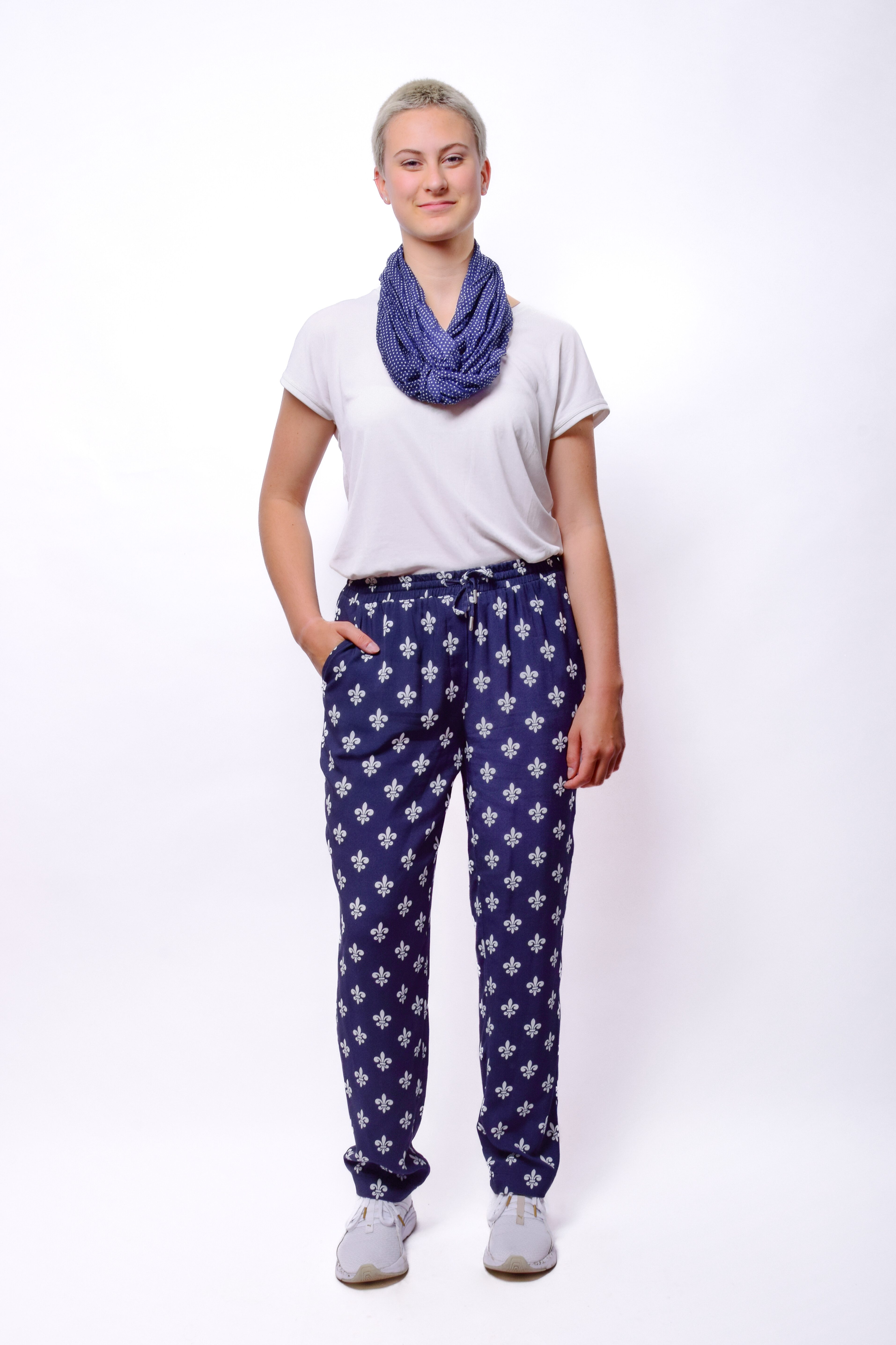 Die einfach Schön Hose Lilian überzeugt in elegantem Dunkelblau mit floralem Muster. Diese Stoffhose ist die perfekte Wahl für einen sportlichen und zugleich stilvollen Look im Frühling und Sommer. Hergestellt aus 100 % Viskose, bietet sie dir ein leichtes und angenehmes Tragegefühl, das ideal für warme Tage ist. Die gerade Passform und der weite Beinverlauf sorgen für ein lässiges und bequemes Trageerlebnis. Der gesmokte Gummibund mit Tunnelzug und Kordeln ermöglicht eine individuelle Anpassung und sorgt für einen perfekten Sitz. Praktische seitliche Taschen bieten Platz für kleine Essentials und runden das Design funktional ab. Mit ihrem floralen Muster bringt die Sommerhose von einfach Schön frische und feminine Akzente in deine Garderobe. Die Stoffhose Lilian von einfach Schön ist ideal für entspannte Freizeitmomente oder modische Feiern. Kombiniert mit einem einfarbigen Damen Shirt erhältst du einen sportlich - lässigen Look. Für einen etwas schickeren Auftritt passt auch wunderbar eine unifarbene Damen Bluse zu der dunkelblauen Stoffhose von einfach Schön. Genieße den hohen Tragekomfort und die modische Optik der einfach Schön Lilian Hose und mach sie zu deinem neuen Lieblingsstück für die warmen Tage.