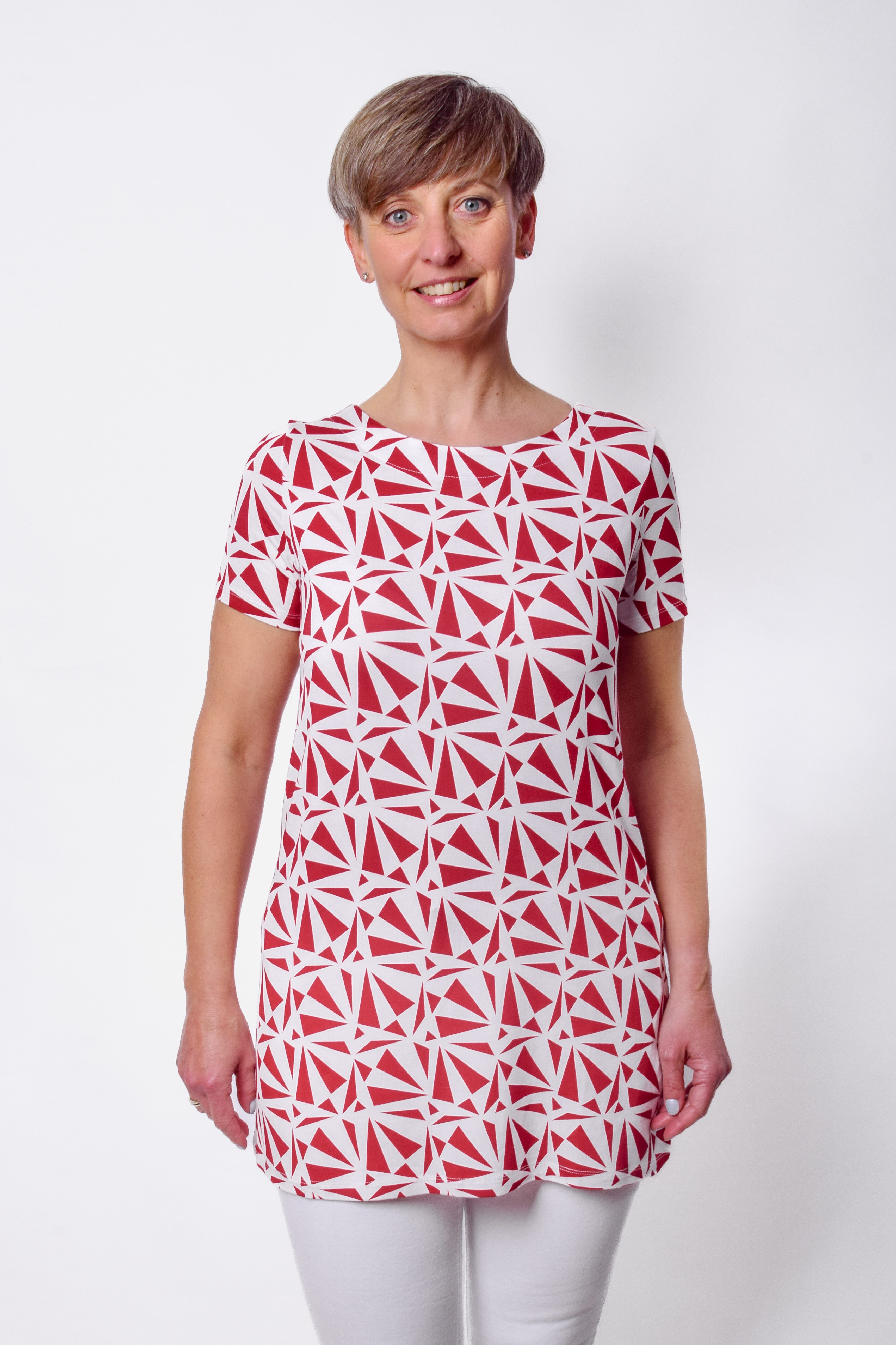 Die einfach Schön Tunika Beatrice überzeugt durch ihre zeitlose Eleganz. Das strahlende rote grafische Muster, verleiht der Tunika Beatrice eine moderne Note und lässt dich inmitten des Frühlings und Sommers erstrahlen. Hergestellt aus hochwertiger 95 % Viskose und 5 % Elasthan, bietet das Modell Beatrice einen außergewöhnlichen Tragekomfort und eine perfekte Passform. Der gerade Schnitt, welcher leicht tailliert ist, umschmeichelt deine Figur und setzt sie gekonnt in Szene. Der klassische Rundhalsausschnitt und die kurzen Ärmel verleihen der roten Tunika Beatrice von einfach Schön einen zeitlosen Charme, während der Bund über die Hüfte reicht, um deine Silhouette zu betonen. Egal, ob du einen entspannten Tag in der Stadt verbringst, einen Ausflug in die Natur unternimmst oder einfach mit Freunden zusammen bist – Beatrice ist die ideale Begleitung für jeden legeren Anlass. Kombiniert mit einer lässigen Damen Jeans oder einer eleganten Damen Hose lässt die einfach Schön Tunika auch dich strahlen.