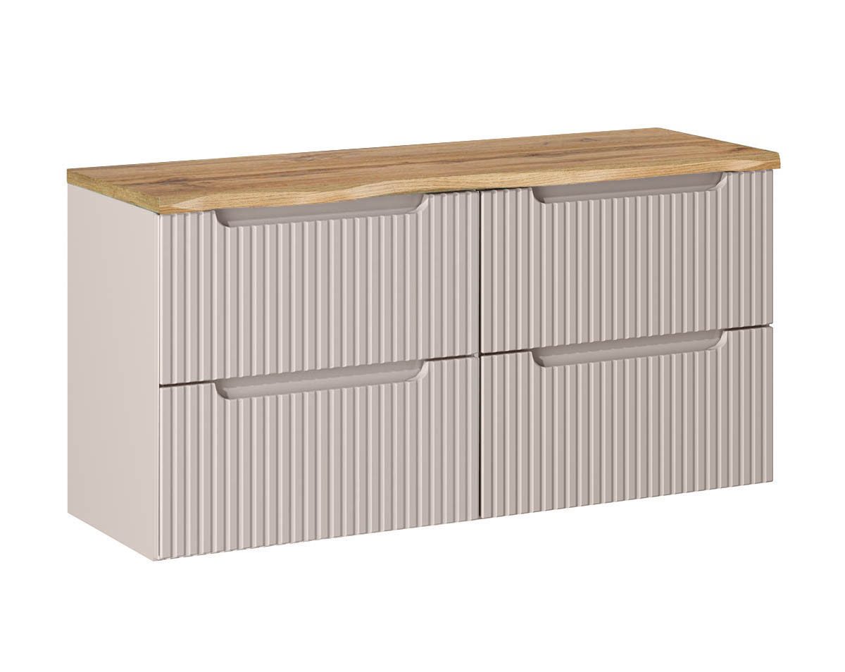 Die Badmöbel der Serie Iluna Cashmere stehen für moderne Eleganz und durchdachte Funktionalität – mit diesem 120cm breiten Doppelwaschtisch zieht ein echtes Design-Highlight in dein Badezimmer ein. Der Waschtischunterschrank in seidenmattem Kaschmir ist mit einer natürlich wirkenden Baumkanten-Oberplatte in der Farbvariante Coast-Evoke ausgestattet – eine warme, holzfarbene Oberfläche mit authentischem Naturkanten-Look.