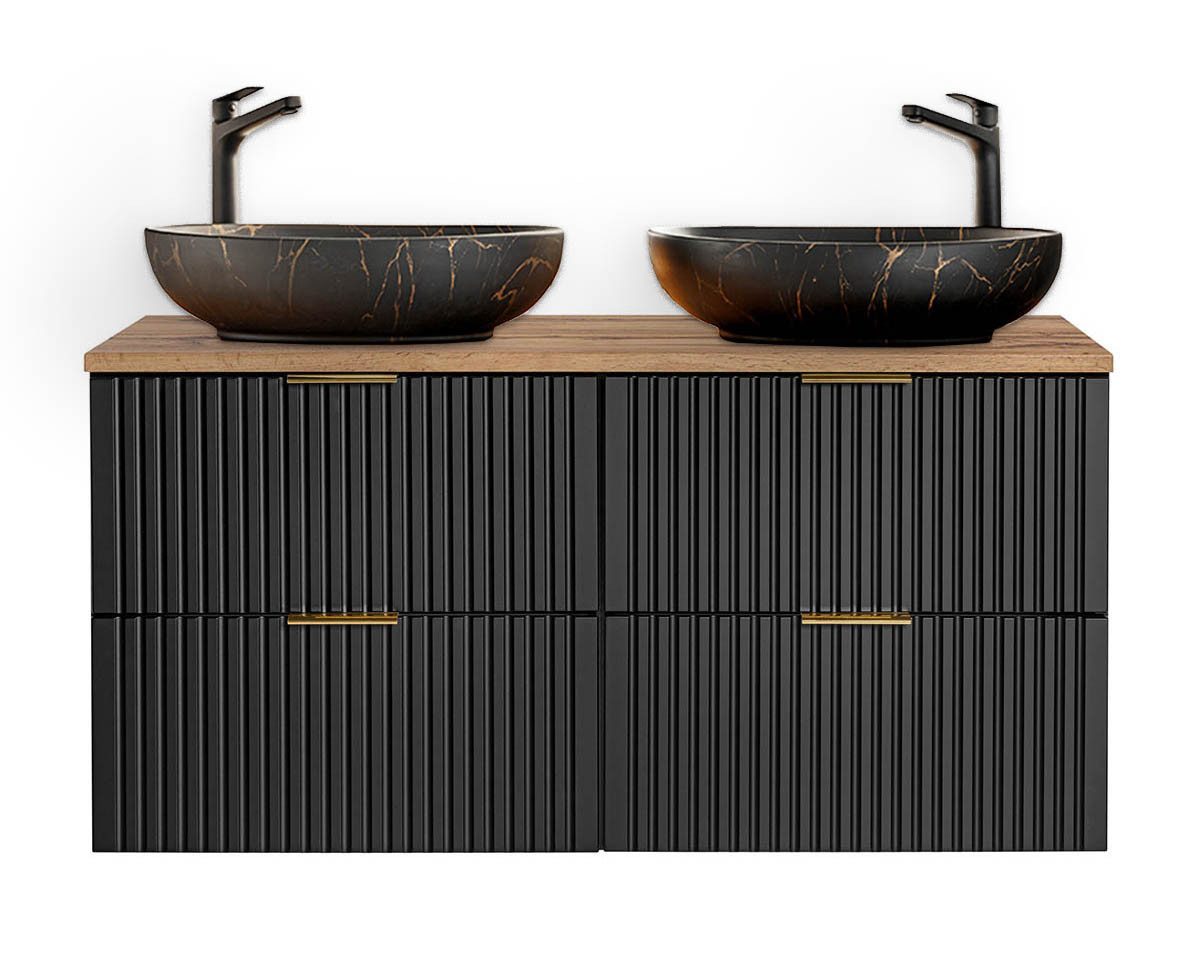 Der Korpus dieses 120cm Doppel-Waschtisches mit zwei Aufsatzbecken ist aus laminiertem Holzwerkstoff, die Fronten aus MDF wurden gefräst uns dann mit einer PVC Folierung beschichtet. Die perfekte Versiegelung gegen im Bad herrschende Feuchtigkeit.