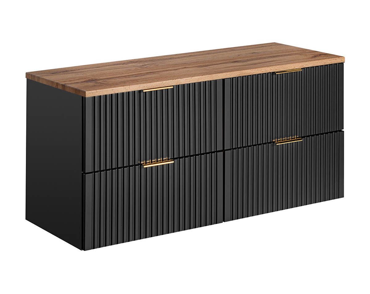Der Korpus dieses 120cm Waschtisches zum Unterbau ist aus laminiertem Holzwerkstoff, die Fronten aus MDF wurden gefräst uns dann mit einer PVC Folierung beschichtet. Die perfekte Versiegelung gegen im Bad herrschende Feuchtigkeit.