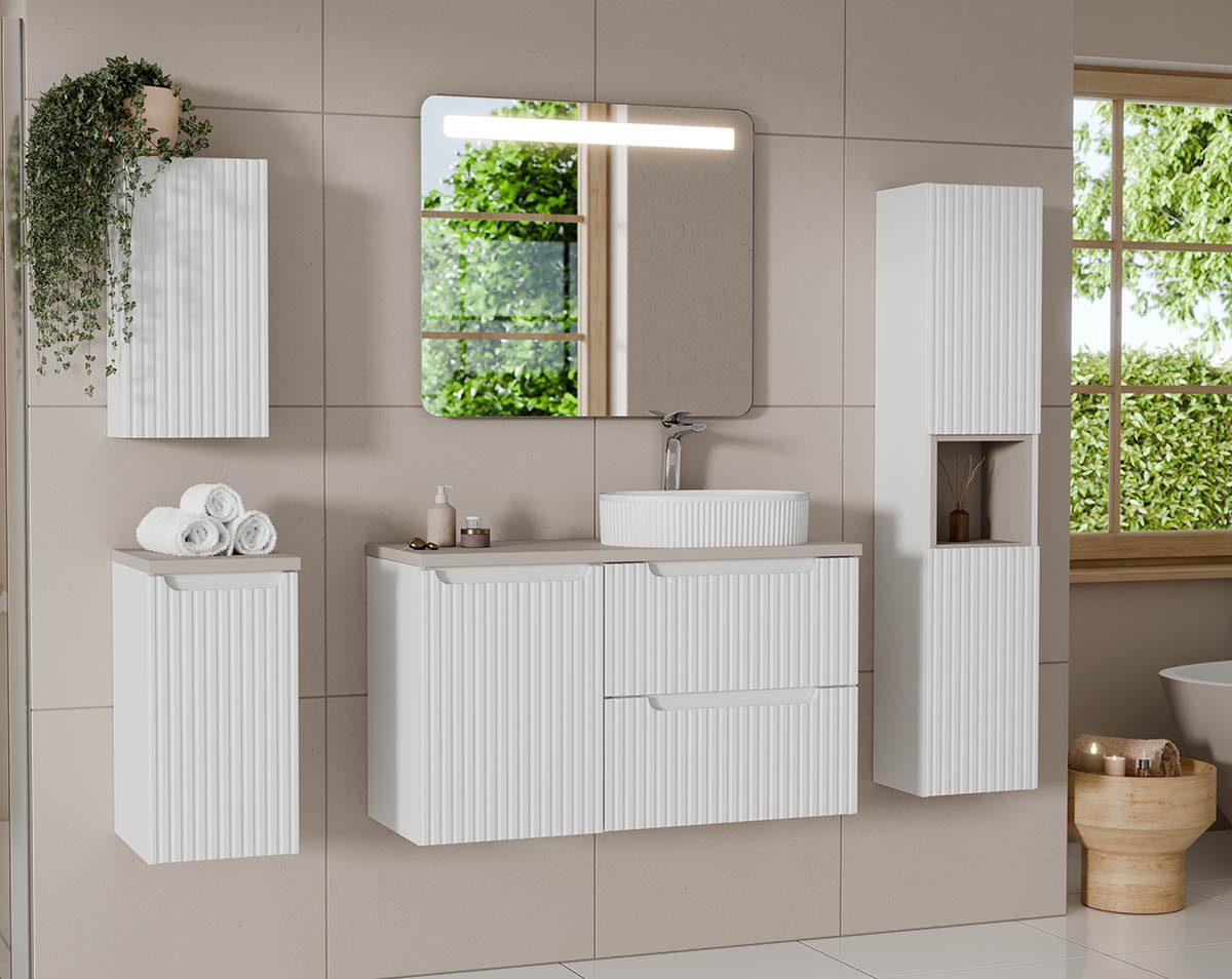 Geradlinig und minimalistisch modern präsentiert sich die Badmöbel Serie "ILUNA White". Die Fronten sind mit vertikalen Rillen verziert, was der Kollektion eine weiche Tiefe und einzigartigen Charakter verleiht. Besondere Details wie die integrierten Griffe vereinen Funktionalität und Design.