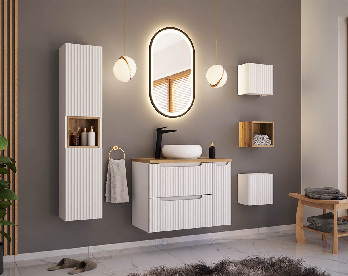 Der Korpus dieses 80cm Waschtisches und Hängeschränke ist aus FSC zertifiziertem laminiertem Holzwerkstoff, die Fronten aus MDF wurden gefräst.