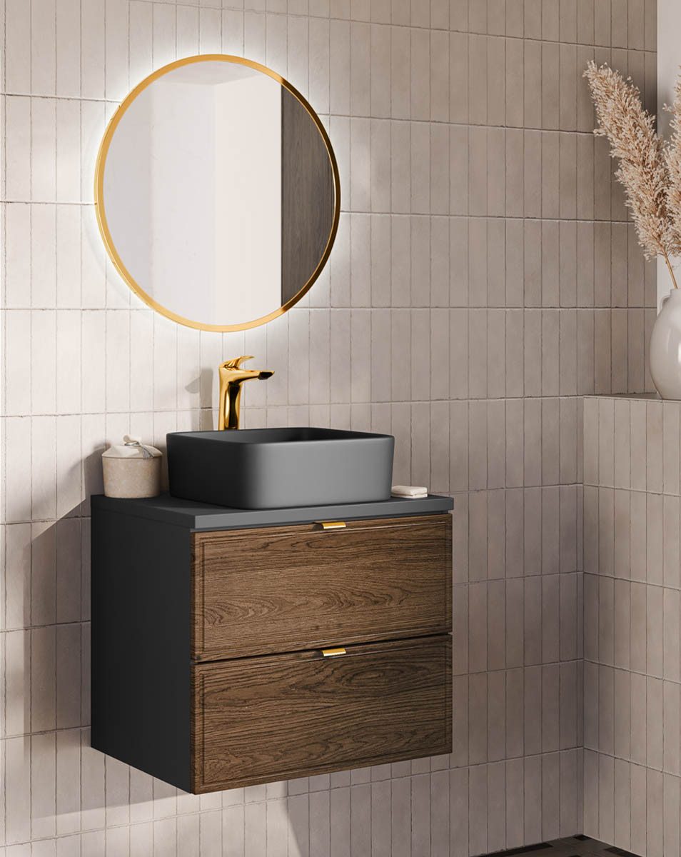Set beinhaltet | 2x Waschtisch Unterschrank, Oberplatte & 2x Aufsatzbecken Keramik mattschwarz & LED Spiegel |