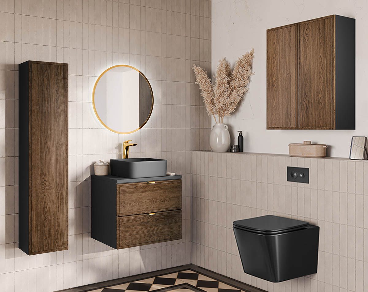Set beinhaltet | 2x Waschtisch Unterschrank, Oberplatte & 2x Aufsatzbecken Keramik mattschwarz & LED Spiegel |
