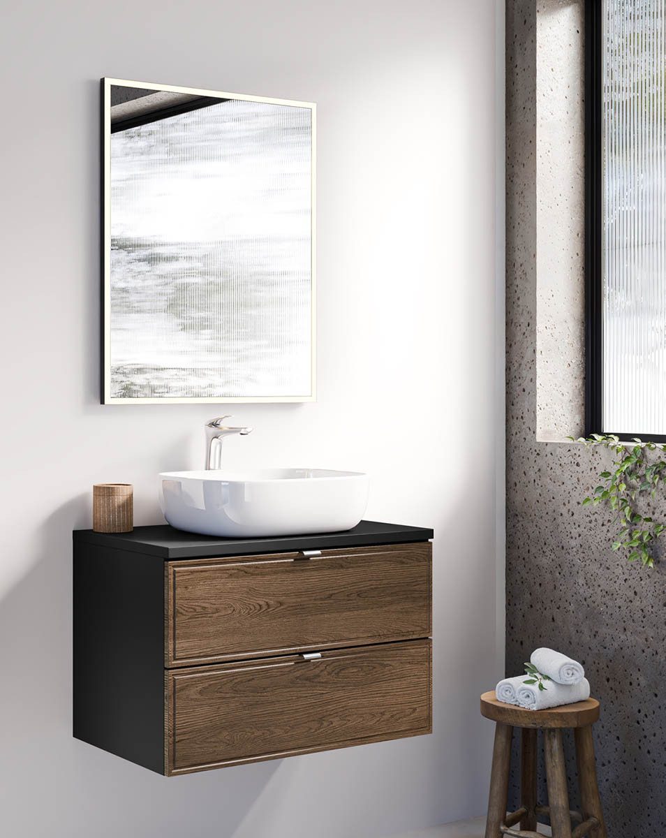 Set beinhaltet | 2x Waschtisch Unterschrank, Oberplatte & 2x Aufsatzbecken Keramik mattschwarz & LED Spiegel |