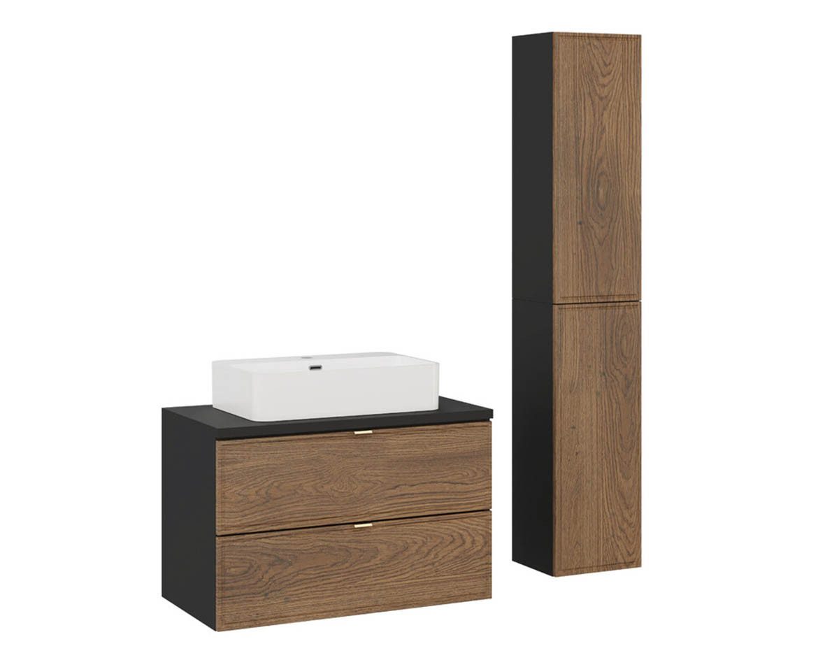 Set beinhaltet | 2x Waschtisch Unterschrank, Oberplatte & 2x Aufsatzbecken Keramik mattschwarz & LED Spiegel |
