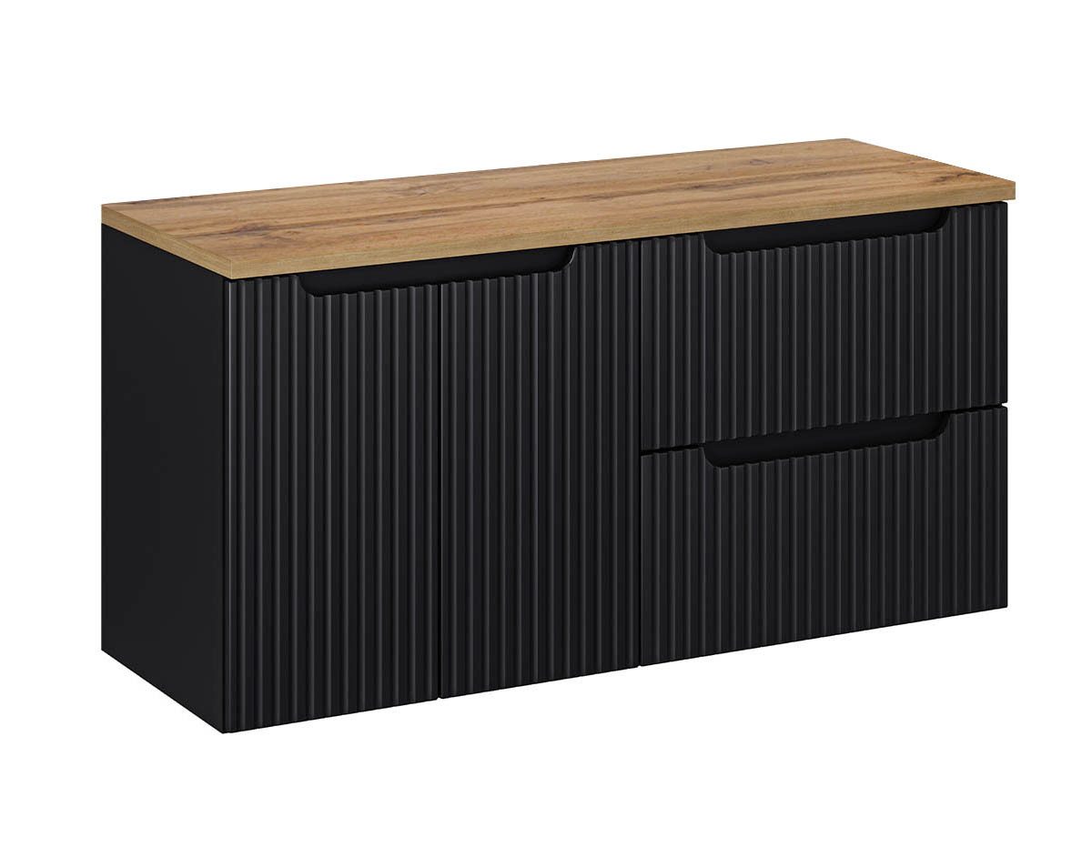 Der Korpus dieses 120cm Waschtisches zum Unterbau ist aus FSC zertifiziertem laminiertem Holzwerkstoff, die Fronten aus MDF wurden gefräst. Auch als Set und in unterschiedlichen Вариантыn erhältlich.