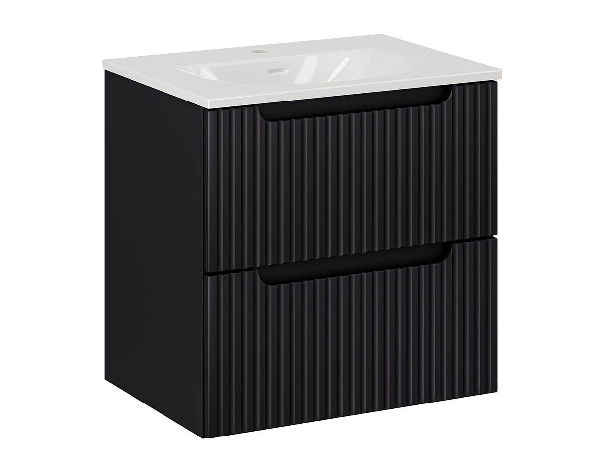 Der Korpus dieses 60cm Waschtisches ist aus FSC zertifiziertem laminiertem Holzwerkstoff, die Fronten aus MDF wurden gefräst. Auch als Set und in unterschiedlichen Вариантыn erhältlich.