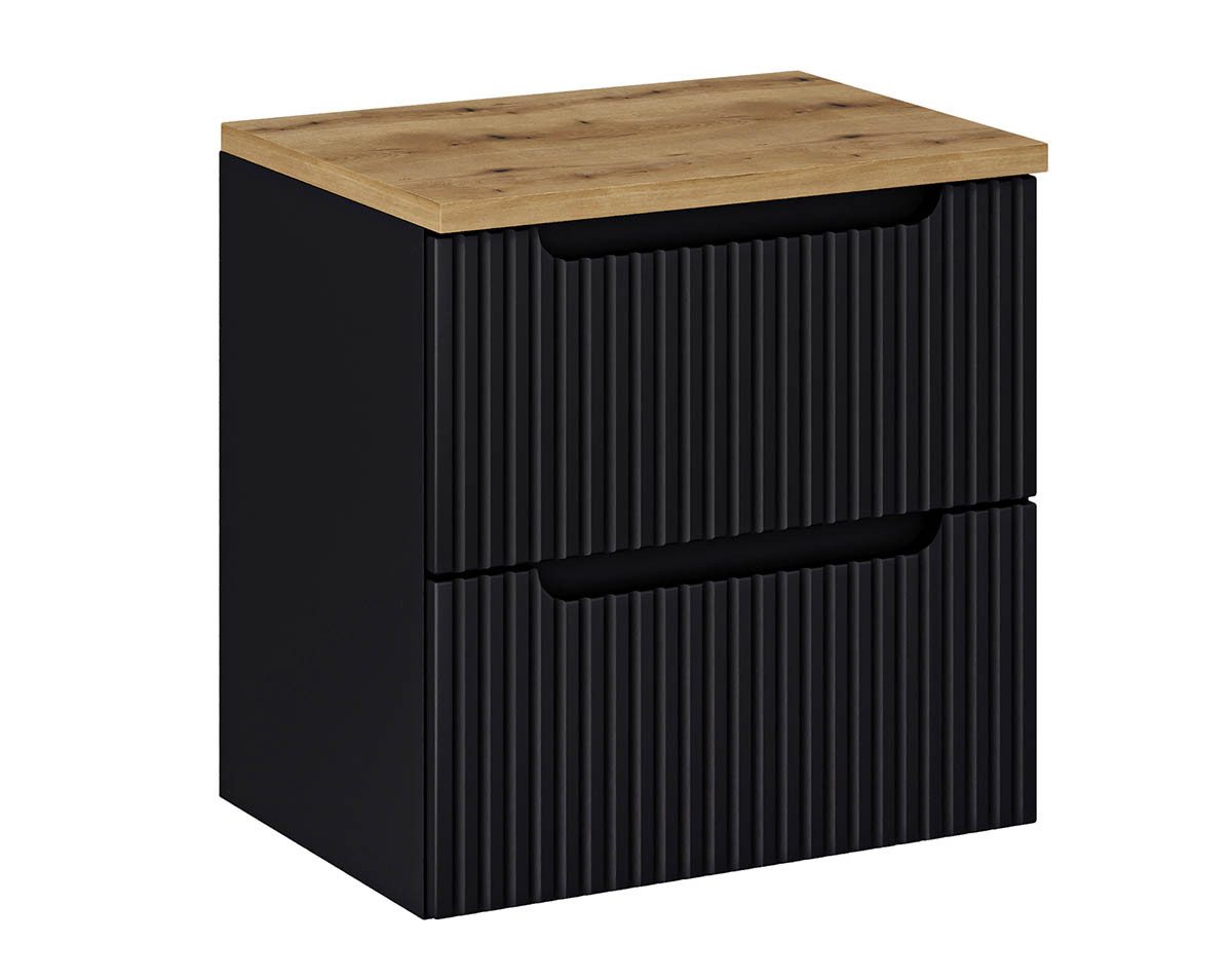 Der Korpus dieses 60cm Waschtisches zum Unterbau ist aus FSC zertifiziertem laminiertem Holzwerkstoff, die Fronten aus MDF wurden gefräst. Auch als Set und in unterschiedlichen Вариантыn erhältlich.
