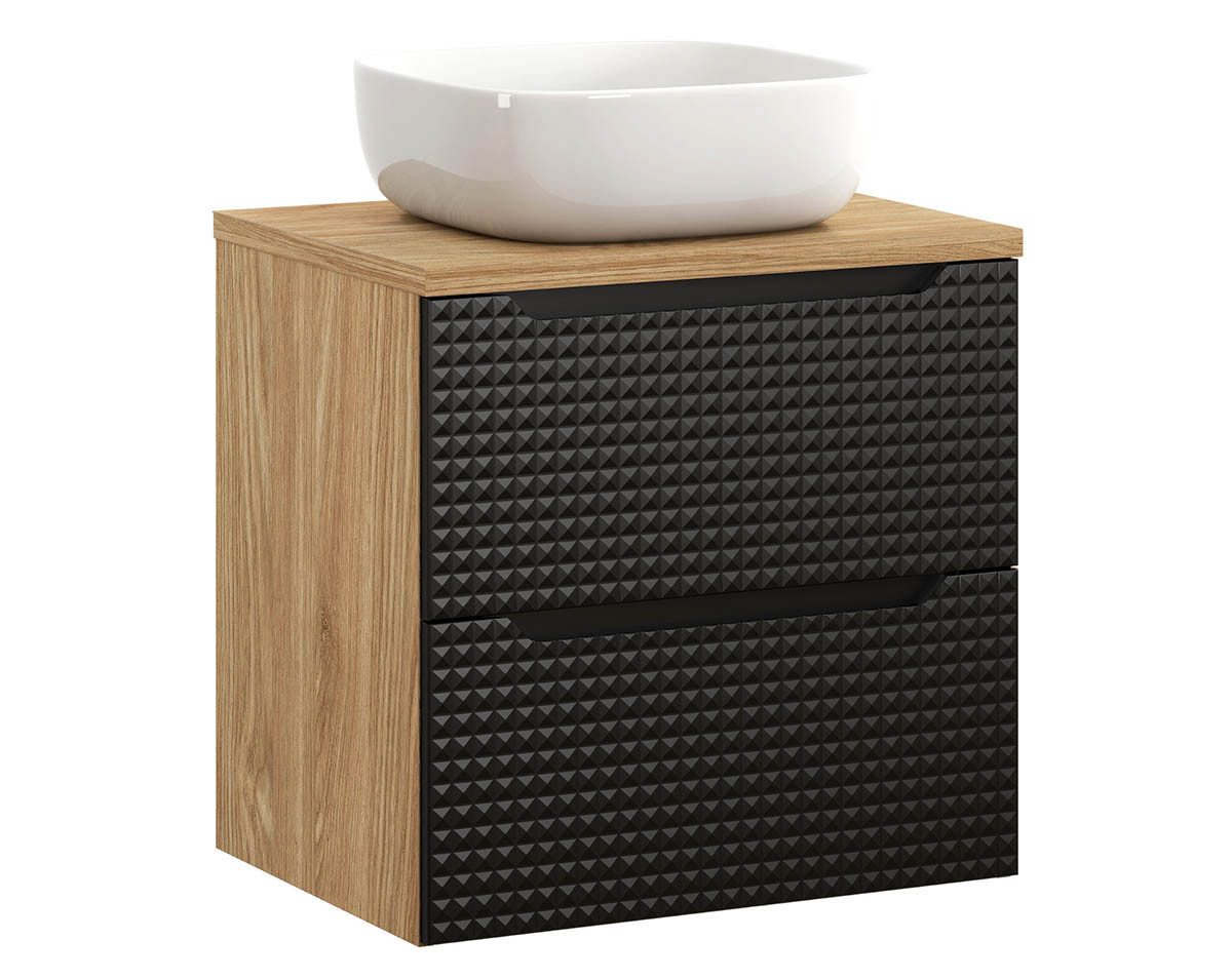 Die Fronten der Möbel sind mit dreidimensionalen, quadratischen Pyramiden verziert, wodurch ein faszinierendes Muster entsteht, das jedem Stück Tiefe und Charakter verleiht. Die gesamte Kollektion ist FSC-zertifiziert, die Fronten sind aus hochwertigem MDF gefertigt, was Langlebigkeit und Solidität gewährleistet, der Korpus dieses Waschtisches ist aus laminiertem Holzwerkstoff. Auch als Set und in unterschiedlichen Вариантыn erhältlich.