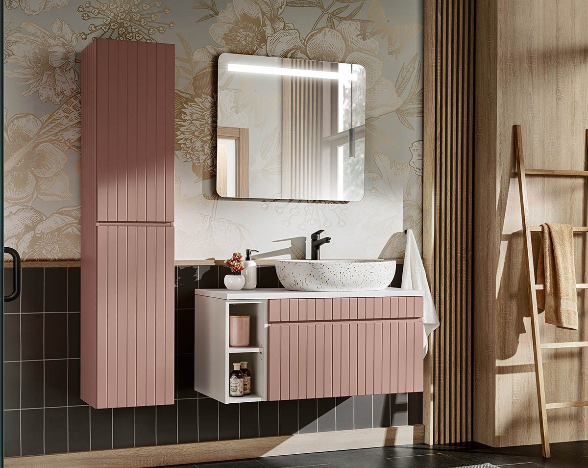 Entdecke die ROSINA Möbelserie fürs Bad. Die gefrästen und beschichteten MDF Fronten präsentieren sich, ebenso wie der glatt folierte Korpus, in einem zarten matten rosé-Farbton. Durch die eingelassenen Griffkanten und das resultierende Fehlen eines Griffes, kommen die schnörkellos-filigran wirkenden Oberflächen perfekt zur Geltung.