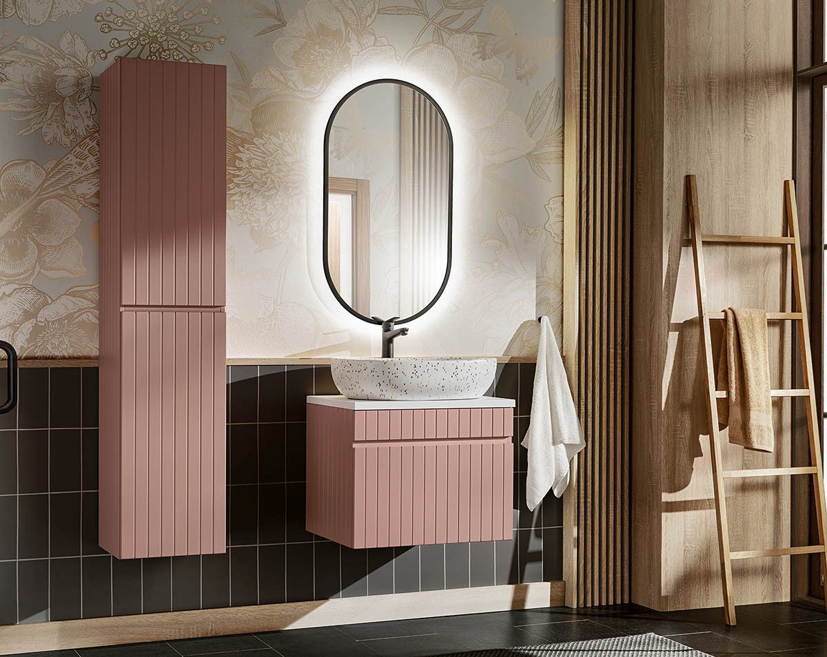 Entdecke die ROSINA Möbelserie fürs Bad. Die gefrästen und beschichteten MDF Fronten präsentieren sich, ebenso wie der glatt folierte Korpus, in einem zarten matten rosé-Farbton. Durch die eingelassenen Griffkanten und das resultierende Fehlen eines Griffes, kommen die schnörkellos-filigran wirkenden Oberflächen perfekt zur Geltung.