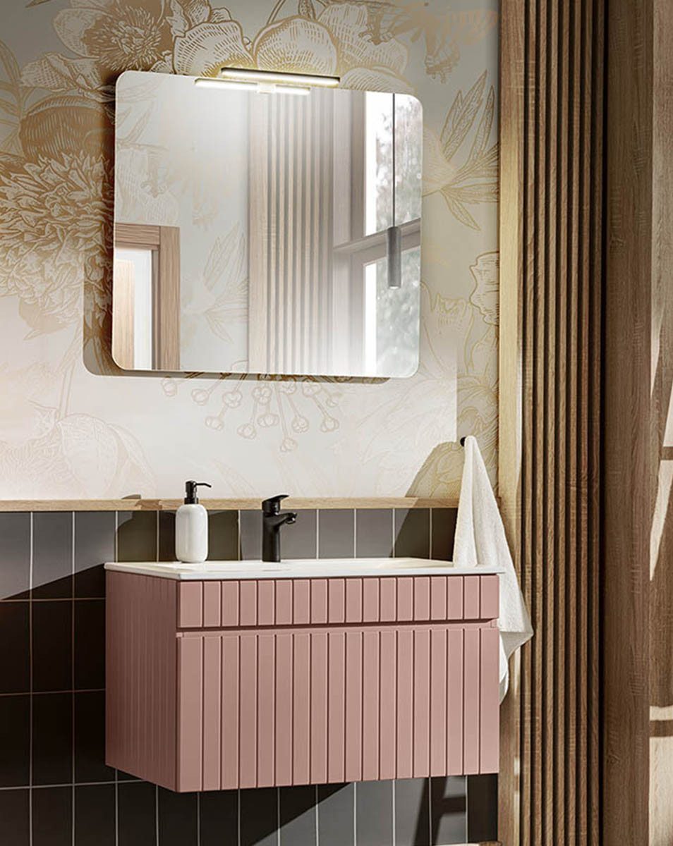 Entdecke die ROSINA Möbelserie fürs Bad. Die gefrästen und beschichteten MDF Fronten präsentieren sich, ebenso wie der glatt folierte Korpus, in einem zarten matten rosé-Farbton. Durch die eingelassenen Griffkanten und das resultierende Fehlen eines Griffes, kommen die schnörkellos-filigran wirkenden Oberflächen perfekt zur Geltung.