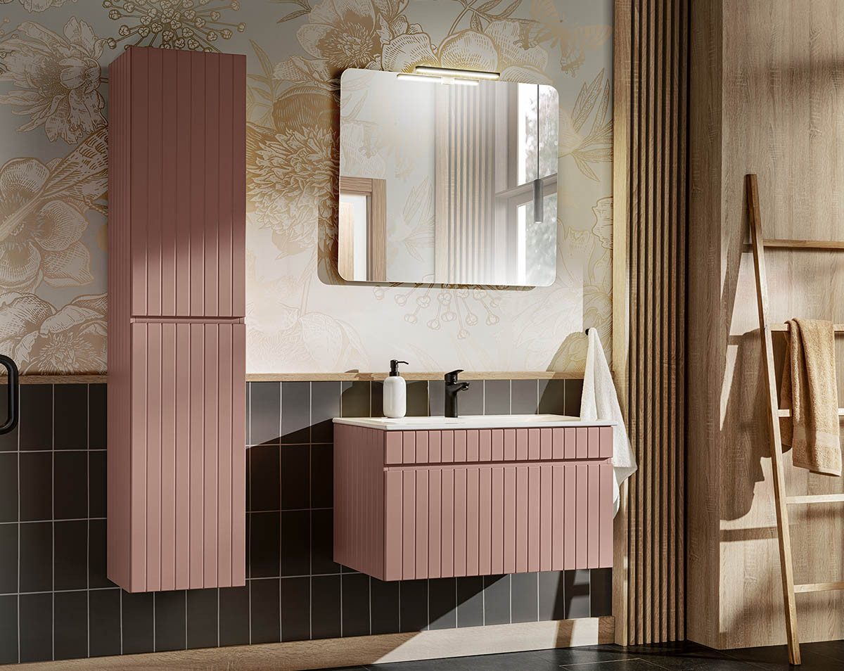 Entdecke die ROSINA Möbelserie fürs Bad. Die gefrästen und beschichteten MDF Fronten präsentieren sich, ebenso wie der glatt folierte Korpus, in einem zarten matten rosé-Farbton. Durch die eingelassenen Griffkanten und das resultierende Fehlen eines Griffes, kommen die schnörkellos-filigran wirkenden Oberflächen perfekt zur Geltung.