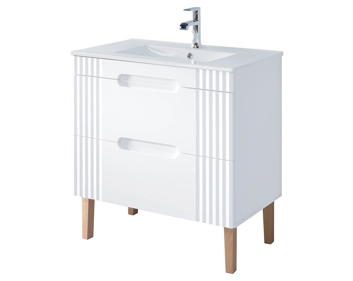 Dieser 80cm breite Stand-Waschtisch mit eingelassenem Keramikwaschbecken verfügt über traumhafte weiße Fronten. Die Vollausstattung für Ihr Bad in strahlendem weiß. Fronten aus MDF mit eingelassenen Griffleisten erscheinen wie aus einem Guss. Die vertikal verlaufenden Fräsungen sorgen für das letzte Quäntchen Extravaganz.