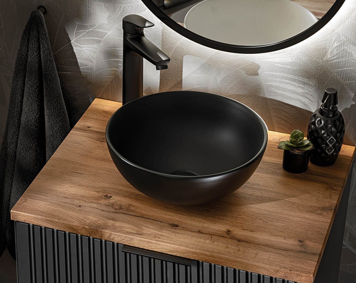 Set beinhaltet | Waschtisch Unterschrank, Oberplatte & Keramikbecken schwarz matt |