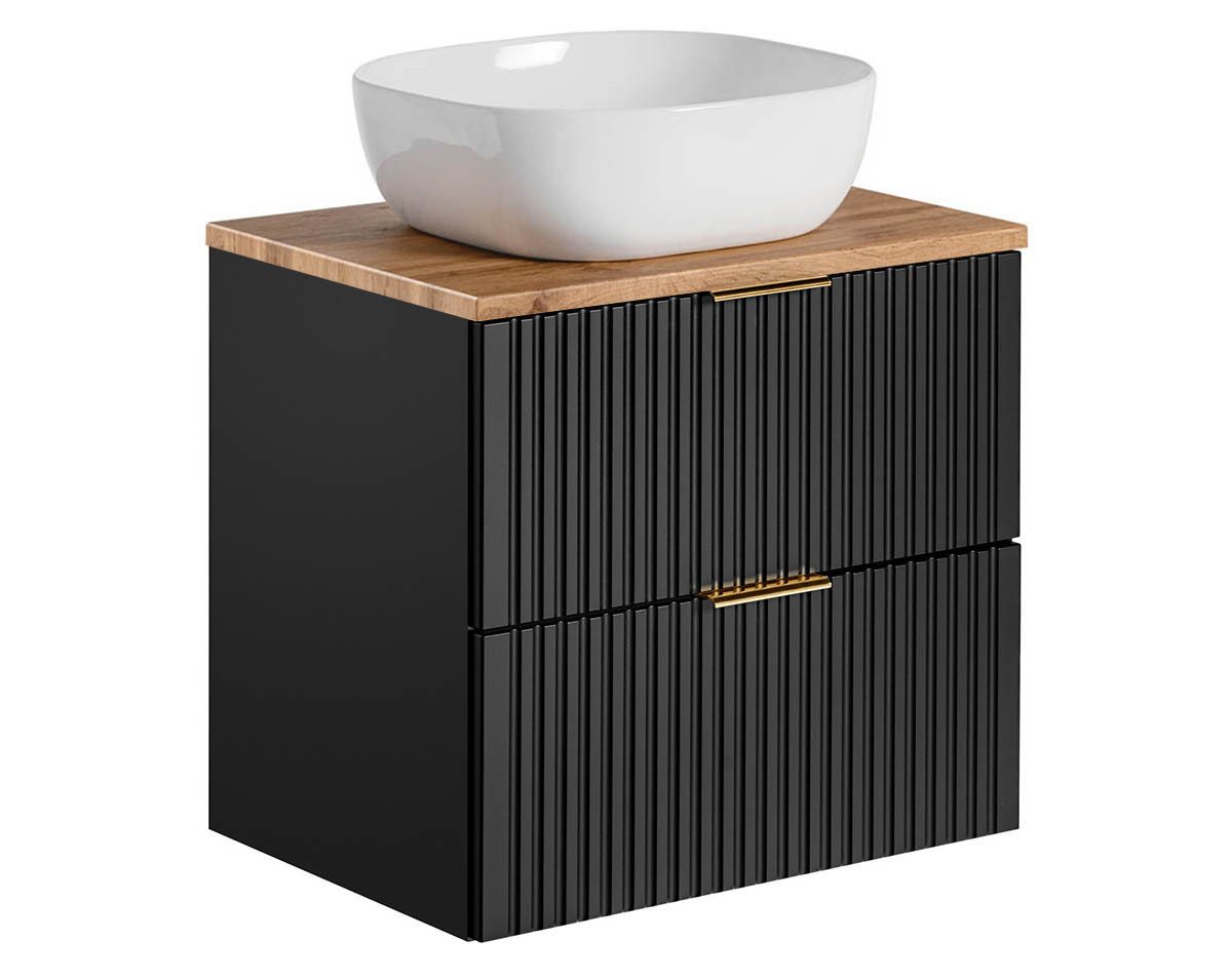 Der Korpus dieses 60cm Waschtisches mit Aufsatzbecken ist aus laminiertem Holzwerkstoff, die Fronten aus MDF wurden gefräst uns dann mit einer PVC Folierung beschichtet. Die perfekte Versiegelung gegen im Bad herrschende Feuchtigkeit.