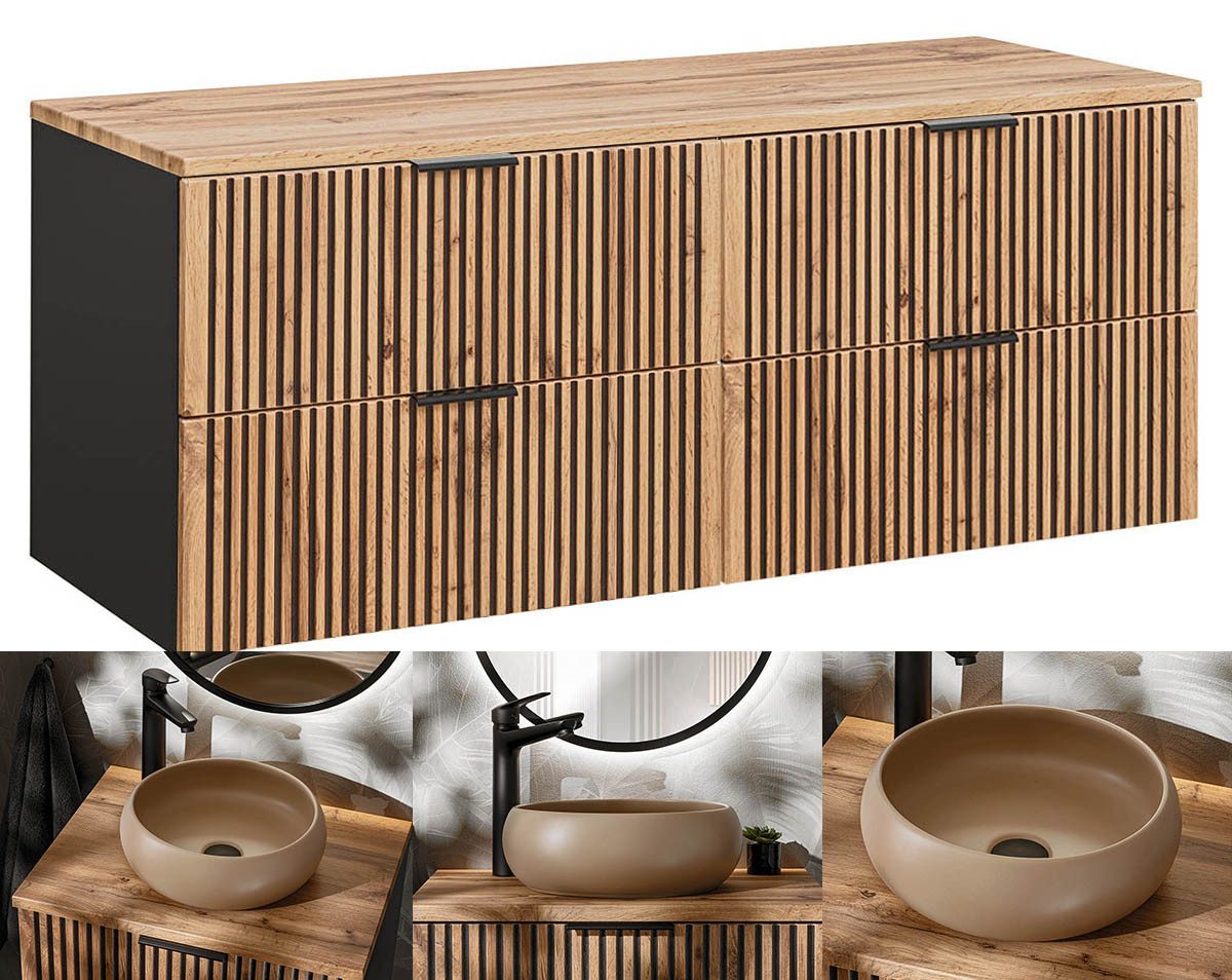 Einen fantastischen Kontrast haben die Designer der Badmöbel "tribune" hier geschaffen. Das kühle mattschwarz der Möbelkorpusse trifft auf die lebendig gemaserte, vom Ton sehr warme, Eiche im "Wotan" Look. Die echte Säge-Schnittkanten nachempfundene Holzoptik wirkt lebendig und schafft, im optischen Zusammenspiel mit den vertikal gefrästen Vertiefungen in Riemchenoptik, ein nie da gewesenes Raumerlebnis. Die Waschtische mit oder ohne Waschbecken sind in Größen von 60cm bis 160cm erhältlich und füllen damit jedes Bad.
