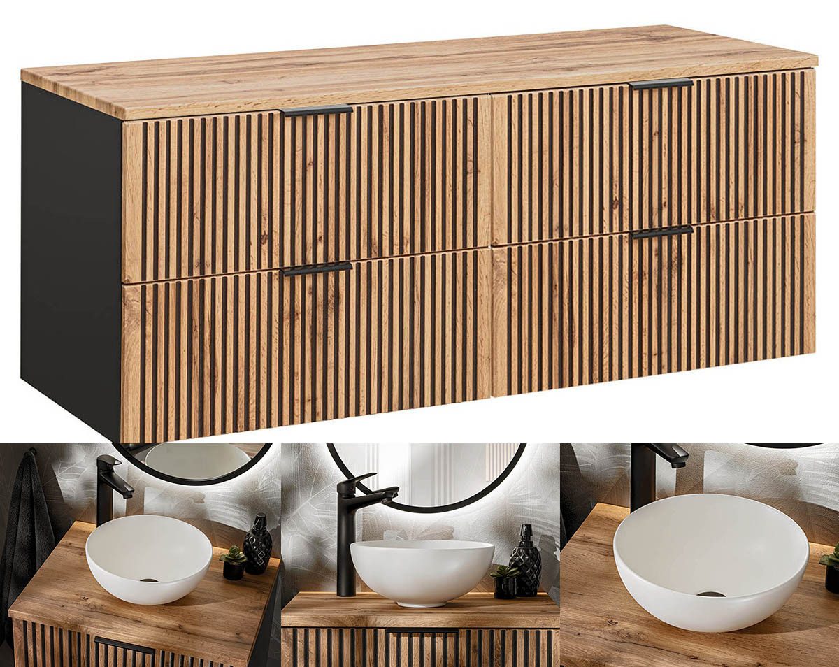 Einen fantastischen Kontrast haben die Designer der Badmöbel "tribune" hier geschaffen. Das kühle mattschwarz der Möbelkorpusse trifft auf die lebendig gemaserte, vom Ton sehr warme, Eiche im "Wotan" Look. Die echte Säge-Schnittkanten nachempfundene Holzoptik wirkt lebendig und schafft, im optischen Zusammenspiel mit den vertikal gefrästen Vertiefungen in Riemchenoptik, ein nie da gewesenes Raumerlebnis. Die Waschtische mit oder ohne Waschbecken sind in Größen von 60cm bis 160cm erhältlich und füllen damit jedes Bad.