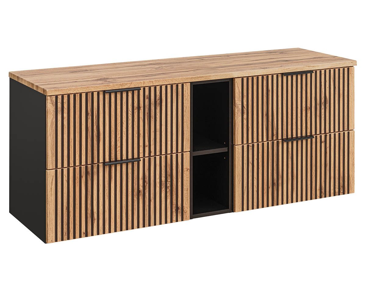 Einen fantastischen Kontrast haben die Designer der Badmöbel "tribune" hier geschaffen. Das kühle mattschwarz der Möbelkorpusse trifft auf die lebendig gemaserte, vom Ton sehr warme, Eiche im "Wotan" Look. Die echte Säge-Schnittkanten nachempfundene Holzoptik wirkt lebendig und schafft, im optischen Zusammenspiel mit den vertikal gefrästen Vertiefungen in Riemchenoptik, ein nie da gewesenes Raumerlebnis. Die Waschtische mit oder ohne Waschbecken sind in Größen von 60cm bis 180cm erhältlich und füllen damit jedes Bad.