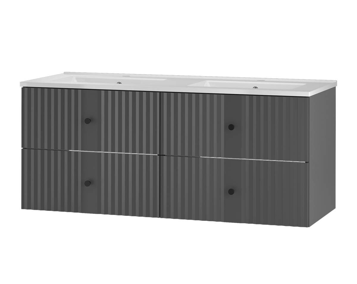 Der AshLine Waschtisch 120cm ist die ideale Doppel-Lösung für Familienbäder. Die vertikal gefrästen MDF-Fronten erzeugen den markanten AshLine-Rhythmus; die graphitfarbene Oberfläche wirkt modern und ruhig. Das passgenaue Keramik-Doppel-Einbaubecken punktet mit pflegeleichter Glasur und klaren Kanten, zwei Mulden bieten komfortables Parallel-Nutzen am Morgen - zu zweit mehr Spaß im Bad!