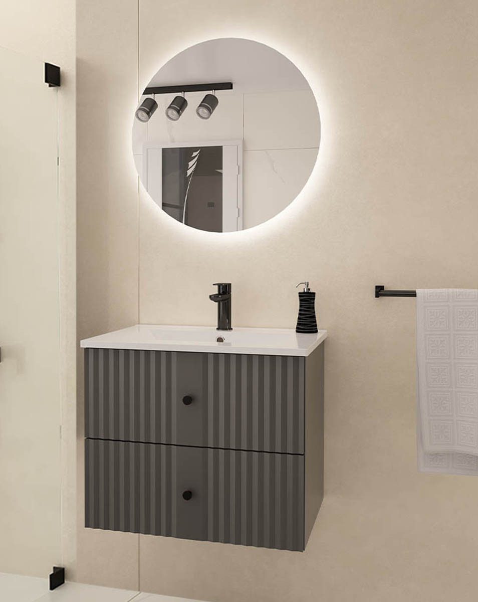 AshLine steht für minimalistisches Design und präzise Verarbeitung. Beim 2-tlg. Set verbinden sich ein 60cm Waschplatz mit Keramik-Einbaubecken und ein runder LED-Spiegel 60cm zu einem stimmigen Gesamtbild. Die vertikal gefrästen MDF-Fronten (18mm) in Graphit wirken strukturiert und ruhig, schwarze Knopfgriffe setzen dezente Akzente. Optional erhältlich ein 1-türiger Hochschrank 130cm.