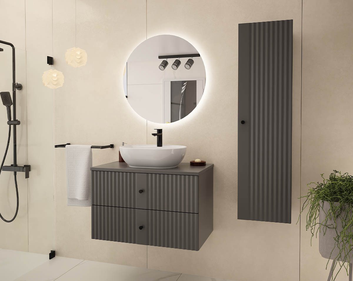 Das 3-teilige AshLine Set verbindet minimalistisches Design mit praxistauglichen Details. Der 80cm Waschplatz erhält mit Oberplatte und Aufsatzbecken eine klare, moderne Anmutung; die präzise vertikal gefrästen MDF-Fronten in Graphit und schwarze Knopfgriffe sorgen für eine ruhige, hochwertige Optik.