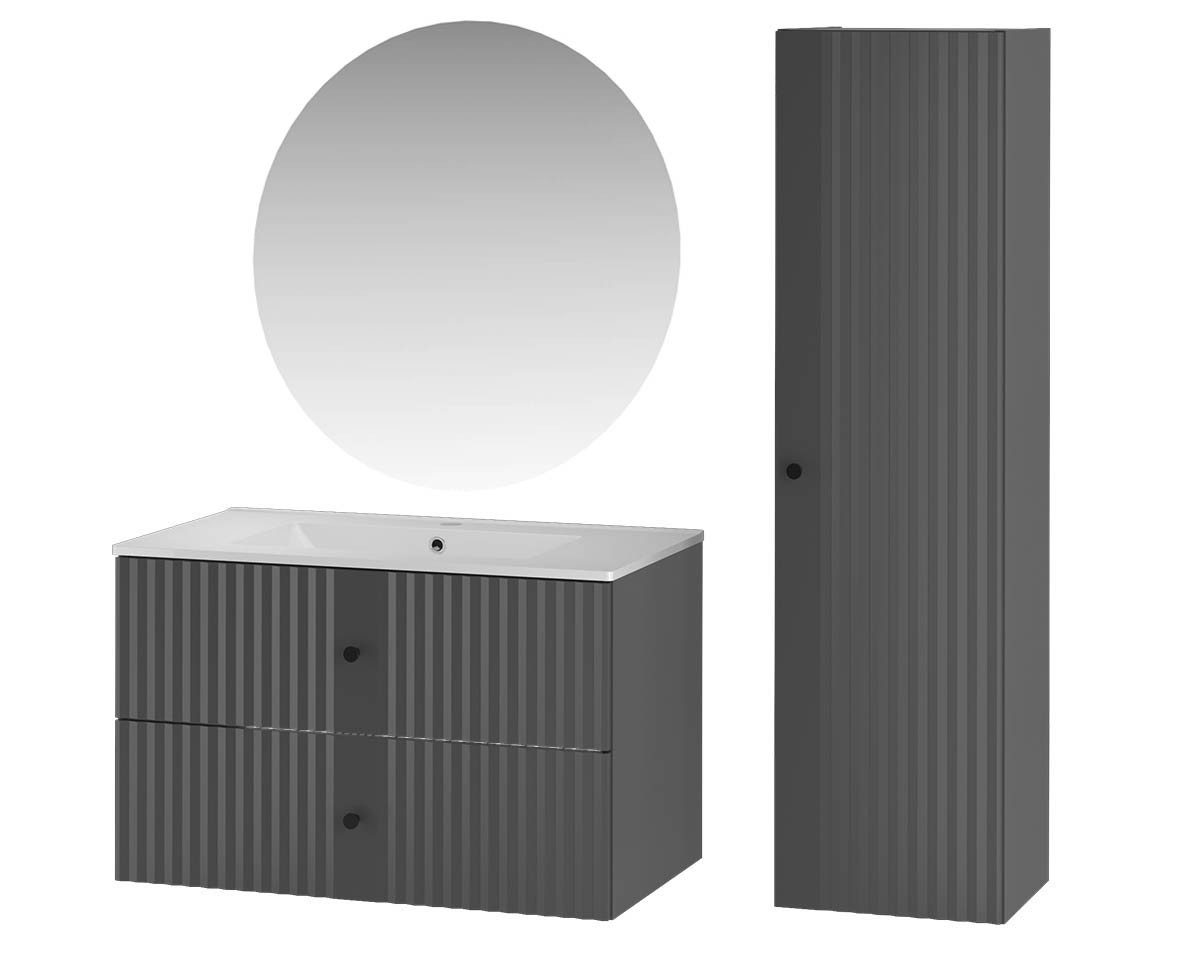 AshLine steht für minimalistisches Design und präzise Verarbeitung. Beim 3-tlg. Set verbinden sich ein 80cm Waschplatz mit Keramik-Einbaubecken, ein 1-türiger Hochschrank und ein runder LED-Spiegel 70cm zu einem stimmigen Gesamtbild. Die vertikal gefrästen MDF-Fronten (18mm) in Graphit wirken strukturiert und ruhig, schwarze Knopfgriffe setzen dezente Akzente.