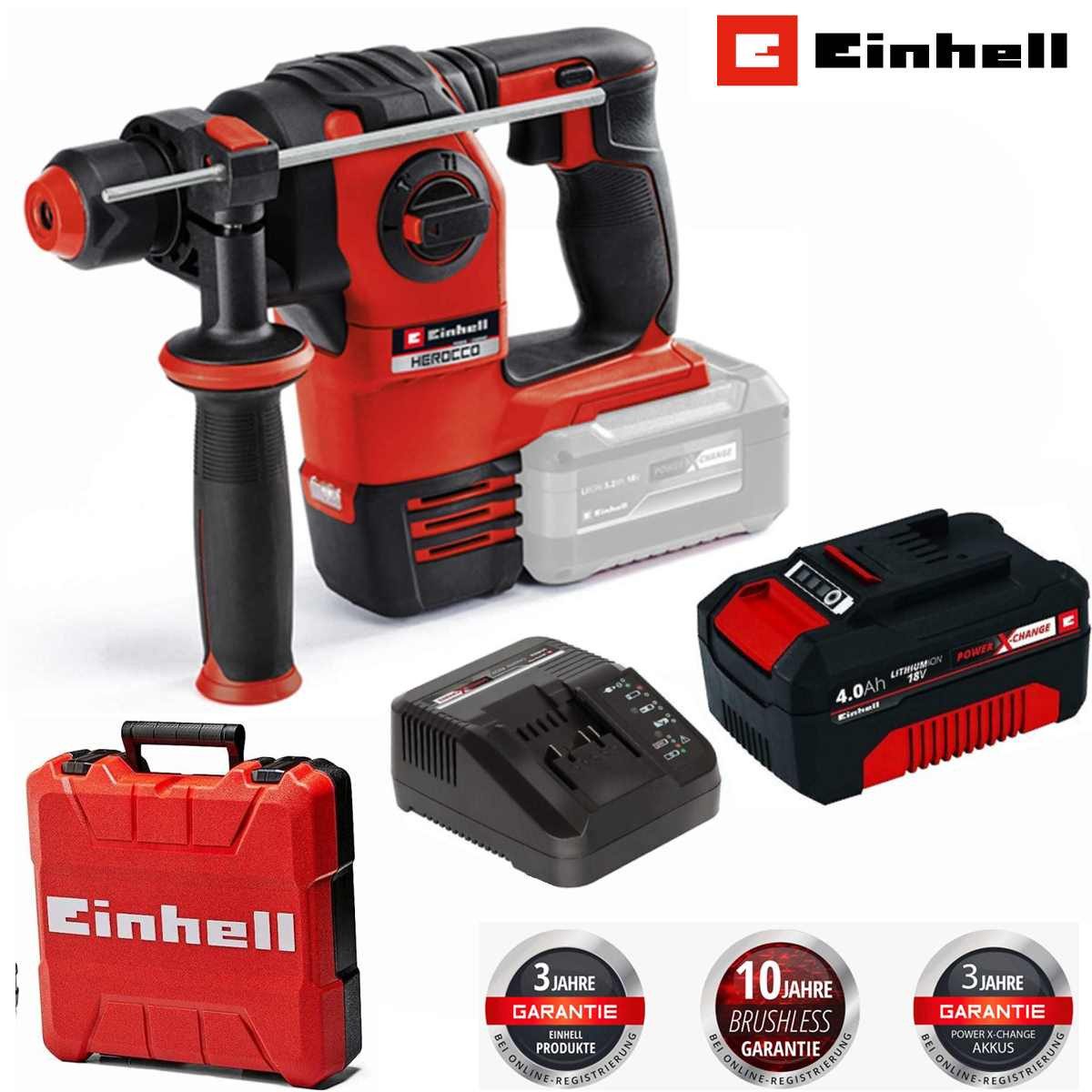 Der Einhell Professional Akku-Bohrhammer HEROCCO 18/20 ist ein gefragter Allrounder: Er liefert zuverlässig Leistung zum Bohren, Hammerbohren oder Meißeln mit oder ohne Fixierung. Angetrieben wird das Gerät von dem Einhell PurePOWER Brushless Motor. Dieser bürstenlose Motor bietet mehr Kraft und eine längere Laufzeit als herkömmliche Kohlebürsten-Motoren. Nach einer Online-Registrierung gelten 10 Jahre Garantie auf den Brushless-Motor. Das pneumatische Schlagwerk arbeitet mit einer Frequenz von bis zu 5.500 Schlägen pro Minute und einer Schlagstärke von 2,2 Joule. Beim Meißeln haben Fliesen oder Ziegelsteine gegen die Kraft des HEROCCO 18/20 keine Chance. Seiner Bohrleistung hingegen können sogar Beton und Granit nicht widerstehen. Für einen flotten Werkzeugwechsel sorgt die Universal SDS-plus-Werkzeugaufnahme mit Halbautomatik. Die Drehzahl-Elektronik lässt sich für das gefühlvolle Arbeiten fein dosieren. Angenehm und ermüdungsfrei ist die Bedienung dank des ergonomischen Griffbereichs mit Softgrip. Der Handgriff ist schwingungsgedämpft für ein vibrationsarmes und damit äußerst präzises Arbeiten. Stufenlos einstellbar ist der robuste Bohrtiefenanschlag aus massivem Metall. Der Akku-Bohrhammer HEROCCO 18/20 ist mit einem LED-Licht zum optimalen Ausleuchten des Arbeitsbereiches ausgerüstet. Zum Lieferumfang gehört der magnetische Bit-Adapter zum Schrauben. Die Lieferung erfolgt im praktischen Transport- und Aufbewahrungskoffer E-Box. Konzipiert als Mitglied der Power X-Change-Familie, können alle Akkus der Systemreihe grenzenlos flexibel in den Werkstatt- und Gartengeräten der Systemreihe verwendet werden.