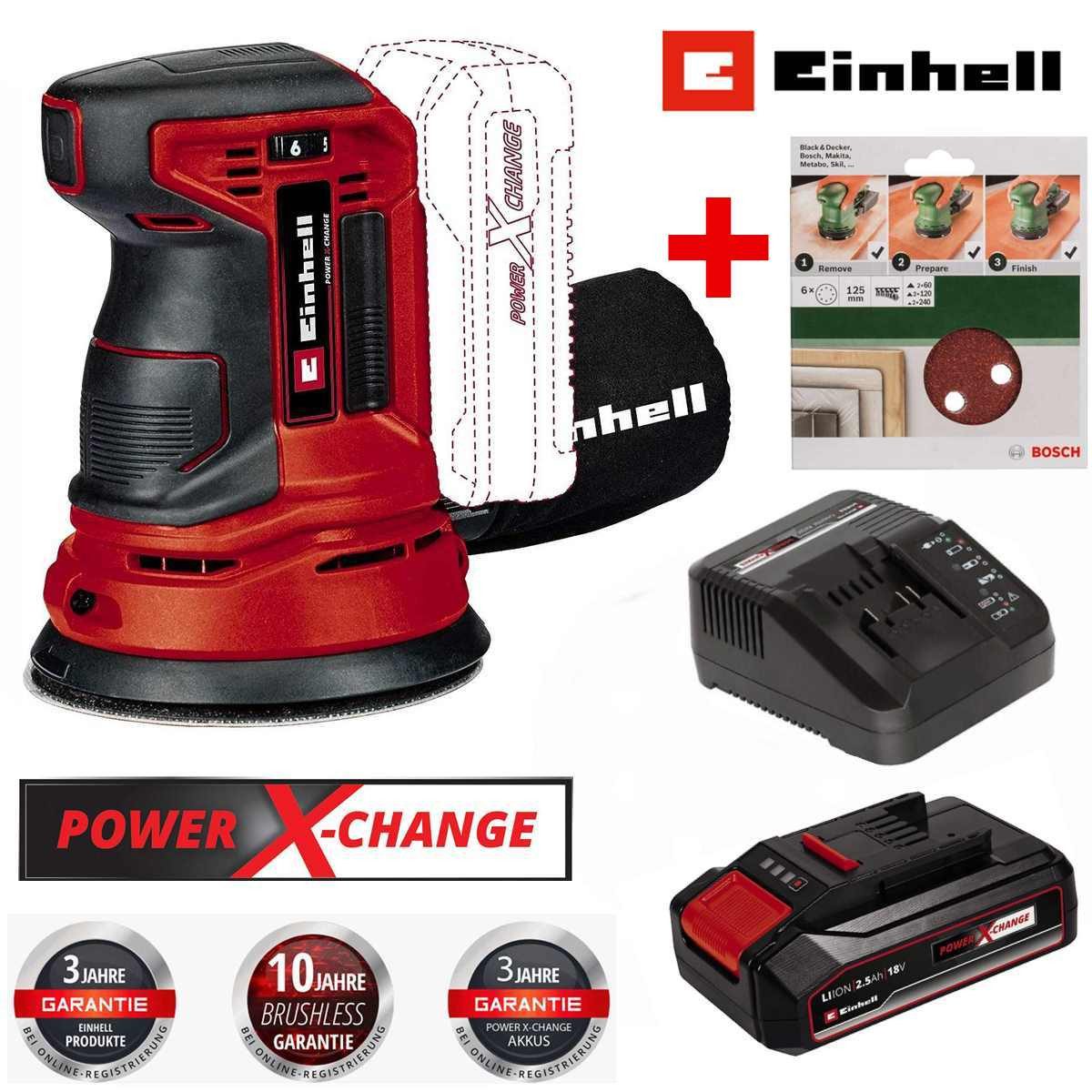 Der Einhell Akku-Exzenterschleifer TE-RS 18 Li - Solo macht den Anwender in Heim, Garage und Werkstatt flexibel, kabellos und unabhängig. Der Akku-Exzenterschleifer ist Mitglied der Power X-Change-Familie. Die Akkus mit den hochwertigen Lithium-Ionen Akkuzellen können bei allen Mitgliedern der Power X-Change Familie angewendet werden. Ob weiche oder kompakte Materialien: durch die Drehzahl-Elektronik lässt sich das Werkzeug für ein material- und anwendungsgerechtes Arbeiten an die zu bearbeitenden Oberflächen anpassen, ob nun Holz, Metalle oder steinartige Strukturen. So ist feinster Schliff bei hoher Schleifleistung dank des Exzenterprinzips möglich. Sicheres und angenehmes Arbeiten ermöglicht der Softgrip. Festen Halt des Schleifpapiers gewährt die Mikro-Kletthaftung, die einen Austausch im Handumdrehen erlaubt. Damit der Arbeitsplatz sauber und staubfrei bleibt, ist eine Staubabsaugung integriert und auch der Anschluss einer externen Staubabsaugung möglich. Zum Lieferumfang gehört ein Schleifpaper (P80).