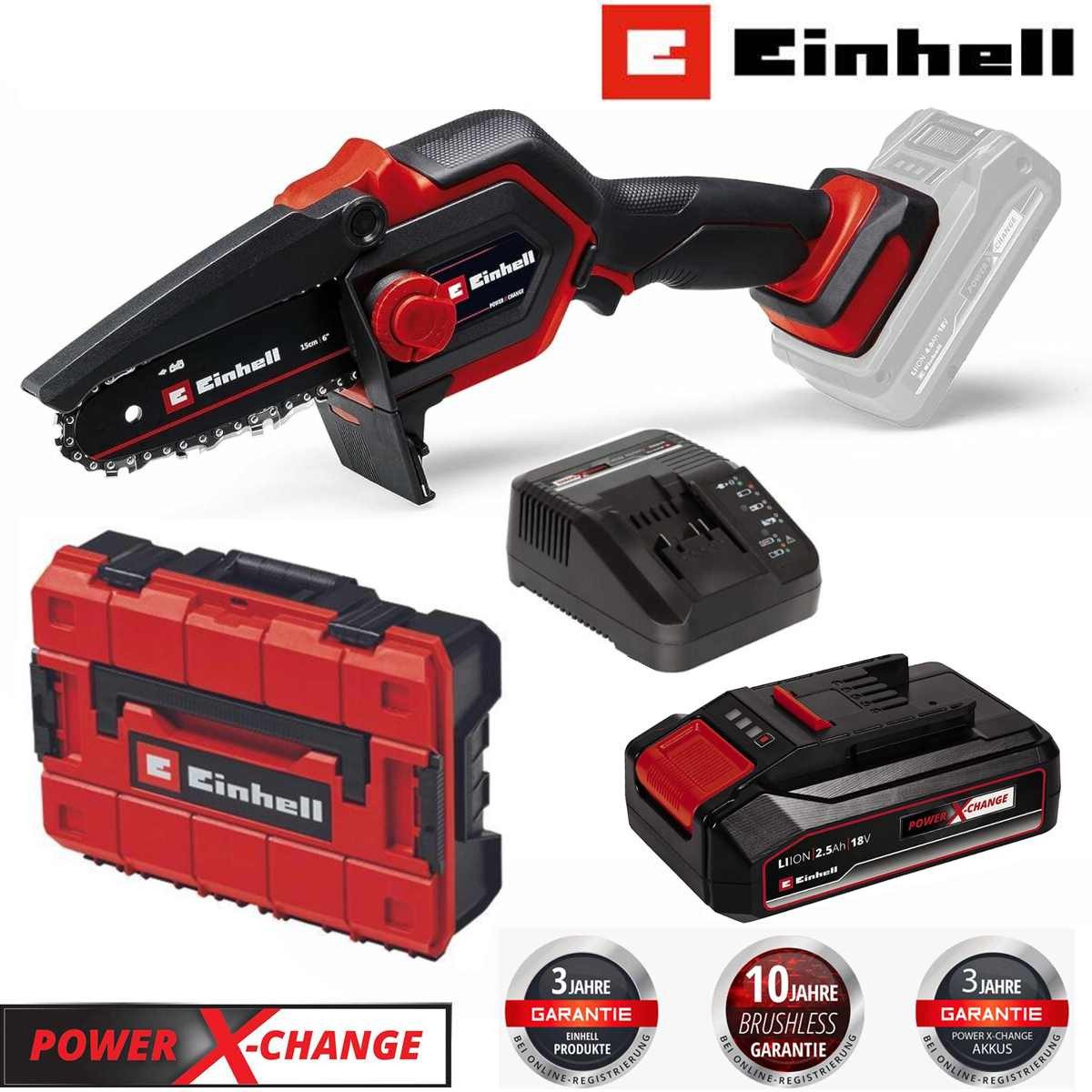 Die Einhell Akku-Astkettensäge GE-PS 18/15 Li BL-Solo ist ein handlicher Helfer für Rück- und Formschnitte von Bäumen und Sträuchern sowie zum Zerkleinern von Grünschnitt und zum Schneiden von kleineren Kanthölzern. Die kompakte Säge ist Mitglied der Einhell Power X-Change Familie und kann mit allen Akkus und Ladegeräten der Systemfamilie kombiniert werden. Angetrieben wird das Gerät von dem Einhell PurePOWER Brushless Motor. Dieser bürstenlose Motor bietet mehr Kraft und eine längere Laufzeit als herkömmliche Kohlebürsten-Motoren. Nach einer Online-Registrierung gelten 10 Jahre Garantie auf den Brushless-Motor. Mit einer Schwertlänge von 15,8 cm und 12,5 cm Schnittlänge eignet sich die kleine und leichte Akku-Astkettensäge optimal zum flexiblen Einsatz im Garten. Der hocheffiziente Motor sorgt für sehr geringe Vibrationen und eine Kettengeschwindigkeit von bis zu 4,8 m/s. Geliefert wird die Säge mit einem hochwertigen Schwert- und Ketten-Set für eine hohe Schnittleistung und beste Arbeitsergebnisse. Zur einfachen Wartung können Schwert und Kette einfach und werkzeuglos gewechselt werden. Zum sicheren und flexiblen Einsatz verfügt die Säge über einen Handschutz und eine klappbare Kettenabdeckung. Angenehm in der Hand liegt das praktische Gartengerät dank des schlanken Griffs, spezieller Softgrip-Flächen und der integrierten Handablagefläche zur beidhändigen Nutzung. Eine Schwertabdeckung wird zur sicheren Lagerung der kleinen Kettensäge mitgeliefert. Ebenfalls im Lieferumfang enthalten sind eine Dosierhilfe zur manuellen Ölung der Kette und ein Innensechskantschlüssel zum Nachspannen der Kette. Dieser wird direkt am Gerät verstaut und ist somit jederzeit griffbereit. Die Lieferung erfolgt mit Akku 2.5 Ah und Ladegerät, Systemkoffer
