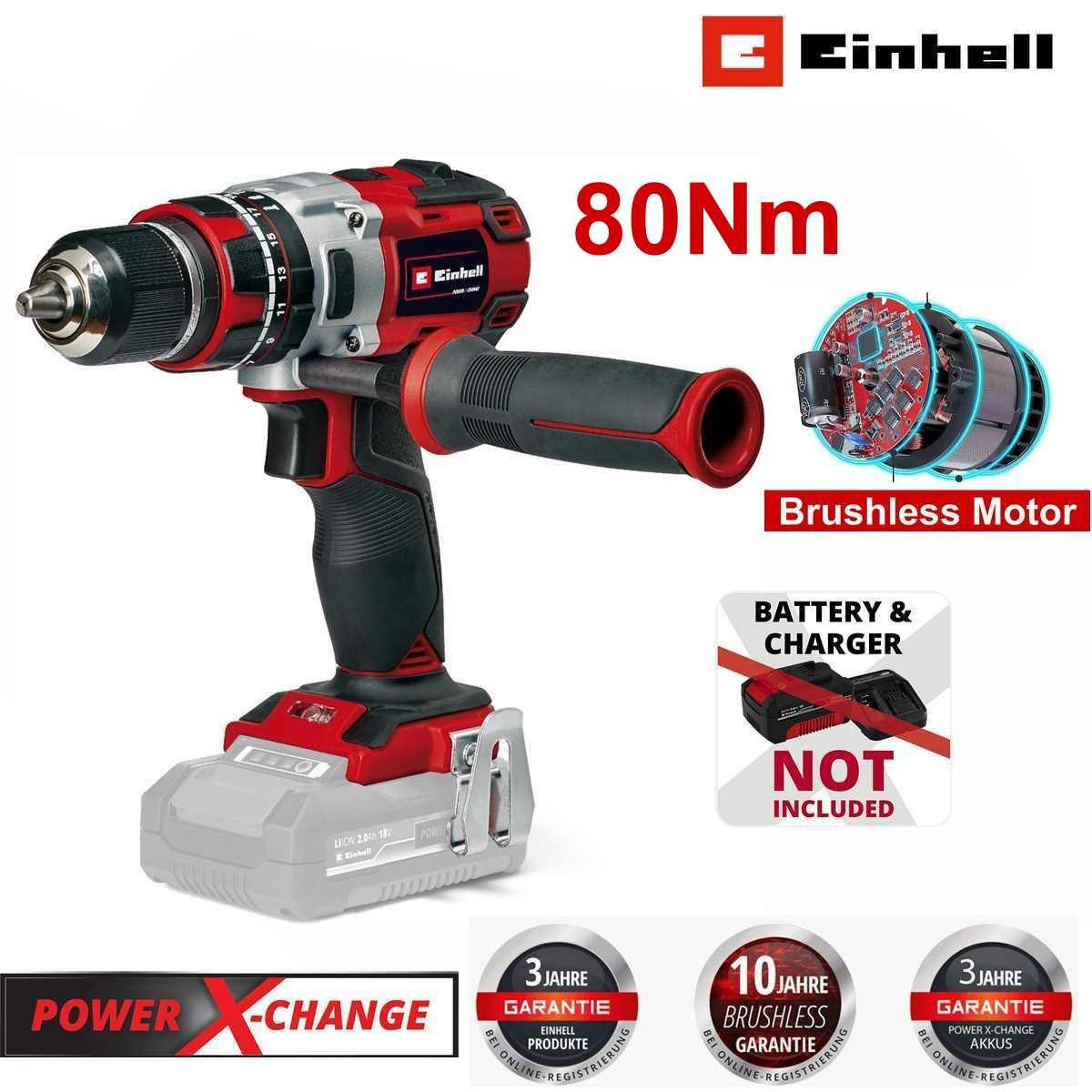 Der Einhell Professional Akku-Schlagbohrschrauber TP-CD 18/80 Li-i BL - Solo ist die perfekte Ergänzung in der Werkstatt eines jeden Heimwerker-Profis. Als Mitglied der Power X-Change Familie kann jedes Ladegerät und jeder 18 V Akku der Systemfamilie verwendet werden. Angetrieben wird das Gerät von dem Einhell PurePOWER Brushless Motor. Dieser bürstenlose Motor bietet mehr Kraft und eine längere Laufzeit als herkömmliche Kohlebürsten-Motoren. Nach einer Online-Registrierung gelten 10 Jahre Garantie auf den Brushless-Motor. Die Schlagbohrfunktion unterstützt den Handwerker bei Arbeiten an widerspenstigen Materialien, wie beispielsweise Stein oder Beton. Zusätzlich verfügt der Schlagbohrschrauber über ein 2-Gang Getriebe für kraftvolles Schrauben und schnelles Schlagbohren mit 8.000 Schlägen pro Minuten im 1. Gang und 28.800 Schlägen im 2. Gang. Dabei verhindert die Drehmomentrutschkupplung eine Überdrehung der Schrauben. Das harte Drehmoment von 80 Nm ist in 20 Drehmomentstufen einstellbar. Mit Hilfe der stufenlosen Drehzahlelektronik gelingt ein anwendungs- und materialgerechtes Arbeiten. Die Quick-Stop-Funktion und das einhülsige 13 mm Schnellspannbohrfutter aus Metall mit Verriegelungsfunktion ermöglichen einen schnellen und einfachen Werkzeugwechsel. Die Gelenke des Anwenders werden durch den Zusatzhandgriff mit Softgrip geschont. Das LED-Licht bietet auch bei schlechter Sicht einen guten Blick auf den Arbeitsbereich. Zur sicheren Zwischenlagerung kann der Schlagbohrschrauber mit dem Gürtelclip am Gürtel befestigt werden. Die Lieferung erfolgt ohne Akku und ohne Ladegerät. Die Akkus und Ladegeräte der Power X-Change Familie sind separat erhältlich.