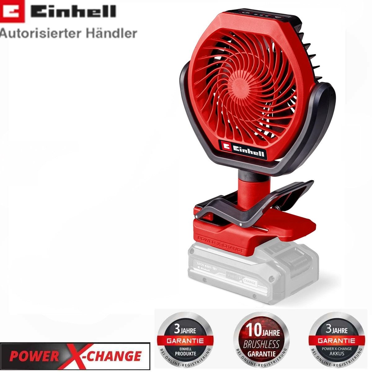 Der Einhell Akku-Ventilator GC-CF 18/110 Li-Solo bringt frischen Wind. Das kabellose Gerät lässt sich an jedem beliebigen Ort einsetzen und sorgt so jederzeit für eine kühle Brise. Der Ventilator ist Mitglied der Power X-Change-Familie. Angetrieben wird das Gerät von einem Einhell Brushless Motor. Dieser bürstenlose Motor bietet mehr Kraft und eine längere Laufzeit als herkömmliche Kohlebürsten-Motoren. Nach einer Online-Registrierung gelten 10 Jahre Garantie auf den Brushless-Motor. Der kompakte und tragbare Akku-Ventilator ist sowohl für Außen-, als auch Inneneinsätze gedacht. Dank seiner gummierten Halteklammer kann der Lüfter rutschfest und stabil an Tischen, Rohren, Fensterbrettern etc. angebracht werden. Damit ist der Einsatz universell – ob auf der Terrasse oder dem Balkon, dem Arbeitszimmer oder Küche, oder in der Werkstatt. Zudem kann das Gebläse an zwei Achsen bewegt werden: an der unteren Achse ist der Akku-Ventilator in beide Richtungen um insgesamt 290° drehbar, während er am Lüfterkopf bis zu 300° neigbar ist. Die Einstellungen sind stufenlos möglich. Zur Einstellung des Luftstroms gibt es drei Stufen. Dabei kann eine Windgeschwindigkeit von 15 km/h mit dem Ø 110 mm großen Lüfterrad erzeugt werden. Geliefert wird der Akku-Ventilator GC-CF 18/110 Li-Solo ohne Akku und Ladegerät. Diese sind separat erhältlich.