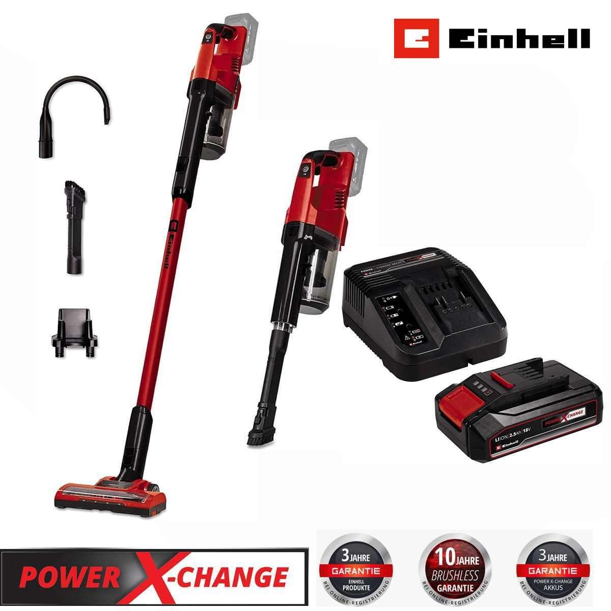 Der Einhell Akku-Stielstaubsauger TE-SV 18 Li-Solo ist Teil des multifunktionalen und grenzenlos untereinander kombinierbaren Einhell Power X-Change Akkusystems. Zur Nutzung des Akku-Stielstaubsauger wird ein 18V Akku benötigt. Ununterbrochenes Arbeiten ohne Kabel: Das ermöglichen das Power X-Change Wechselakku-System und die Schnellladetechnologie. Ist der eingesetzte Akku leer, kann er einfach gegen einen vollgeladenen getauscht werden. Je nach Akku können zudem sehr lange Laufzeiten erreicht werden, denn zum Beispiel der 6 Ah Akku liefert dem Staubsauger im ECO-Modus bis zu 80 Minuten lang Energie. Die vier Spotlight LEDs und ein um zwei Achsen bewegbares Gelenk an der Bodendüse ermöglichen eine einfache Reinigung, auch von dunklen und schwer erreichbaren Stellen wie zum Beispiel unter einem Bett oder Schrank. Die gummibereiften Räder sind leise und schonen empfindliche Bodenbeläge wie Parkettböden. Dank der kompakten und leichten Bauform liegt der Akku-Staubsauger auch bei längeren Arbeiten ermüdungsfrei und bequem in der Hand. So wird Staubsaugen zum echten Kinderspiel. Das effiziente 3-fach Filtersystem bestehend aus einem Vorfilter, einem wechsel- und waschbaren Faltenfilter und einem Motorfilter und der integrierte Zyklonabscheider sorgen für saubere Ausblasluft und effizientes Saugen mit hoher Saugkraft. Der Schmutzfangbehälter wird ganz einfach per Knopfdruck entleert, ein extra Beutel wird nicht benötigt. Das schont die Umwelt, spart Geld und ist zugleich sehr hygienisch, da der Nutzer nicht mit dem Schmutz in Kontakt kommt. Durch zwei einstellbare Saugleistungen kann der Staubsauger an jede Situation angepasst werden. Der ECO-Modus kann bei normalen Verschmutzungen und für maximale Laufzeit verwendet werden, der BOOST-Modus sorgt hingegen für maximale Saugleistung bei hartnäckigen Verschmutzungen, wie beispielsweise auf Teppichen. Dank der Kombination zweier Bauformen ist der Akku-Staubsauger ein praktisches 2-in-1 Gerät. Er kann sowohl klein und leicht als Handstaubsauger benutzt werden, als auch zur Bodenreinigung, wobei er als Stielstaubsauger mit perfektem Handling beeindruckt. Die motorisierte Bodendüse wurde entwickelt, um Staub und hartnäckigen Schmutz sowohl vom Hartboden, als auch von Teppichböden und aus Teppichen zu entfernen. Die Bürste lässt sich zudem einfach lösen und bequem reinigen. In der Lieferung enthalten ist eine Wandhalterung, welche Platz für die Lagerung des Staubsaugers und des Zubehörs bietet, sodass alles sauber verstaut, aber zu jeder Zeit griffbereit ist. Die mitgelieferte flexible Fugendüse ist ideal geeignet, um an schwer erreichbaren Stellen zu saugen, beispielsweise zwischen den Sitzen im Auto. Ein einmaliges Betätigen des Einschalters reicht aus, damit der Staubsauger durchgehend läuft. Der Einschaltknopf muss nicht dauerhaft gedrückt werden. Die Lieferung des Akku-Stielstaubsaugers erfolgt mit Akku und Ladegerät,