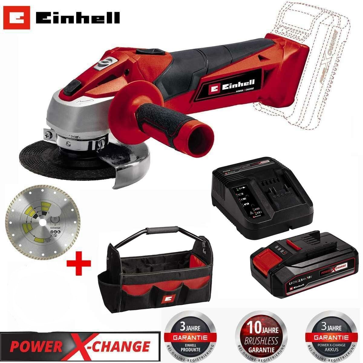 Der Einhell Akku-Winkelschleifer TC-AG 18/115 Li – Solo ist mit seinem geringen Gewicht der leichteste und damit handlichste seiner Klasse. Ob kraftvolles Trennen, Schleifen oder Polieren, mit einer Leerlaufdrehzahl von 8.500 Umdrehungen pro Minute ist der Winkelschleifer auf Leistung ausgelegt und damit ein nützlicher Helfer in der heimischen Werkstatt und dem Hobbykeller. Das Werkzeug gehört zur gefragten Power X-Change-Familie: die Akkus der leistungsstarken Lithium-Ionen-Systemreihe sind in allen Geräten der PXC-Serie verwendbar. Softstart und Wiederanlaufschutz sorgen für eine erhöhte Anwendungssicherheit, der Überlastschutz wiederum für die Langlebigkeit. Durch die Entkopplung von Motor und Getriebe ist für eine besonders hohe Laufruhe gewährleistet. Die geänderte Luftführung sorgt für eine bessere Kühlung und damit für eine lange Lebensdauer. Das Getriebegehäuse ist aus robustem und gleichzeitig leichtem Aluminium gefertigt, die Bauform schlank konstruiert. Ausgestattet mit einem ergonomischen Softgrip, ist der Zusatzhandgriff in drei unterschiedlichen Positionen montierbar. Für optimale Ergebnisse wird ein 2,5 Ah Akku oder größer empfohlen.