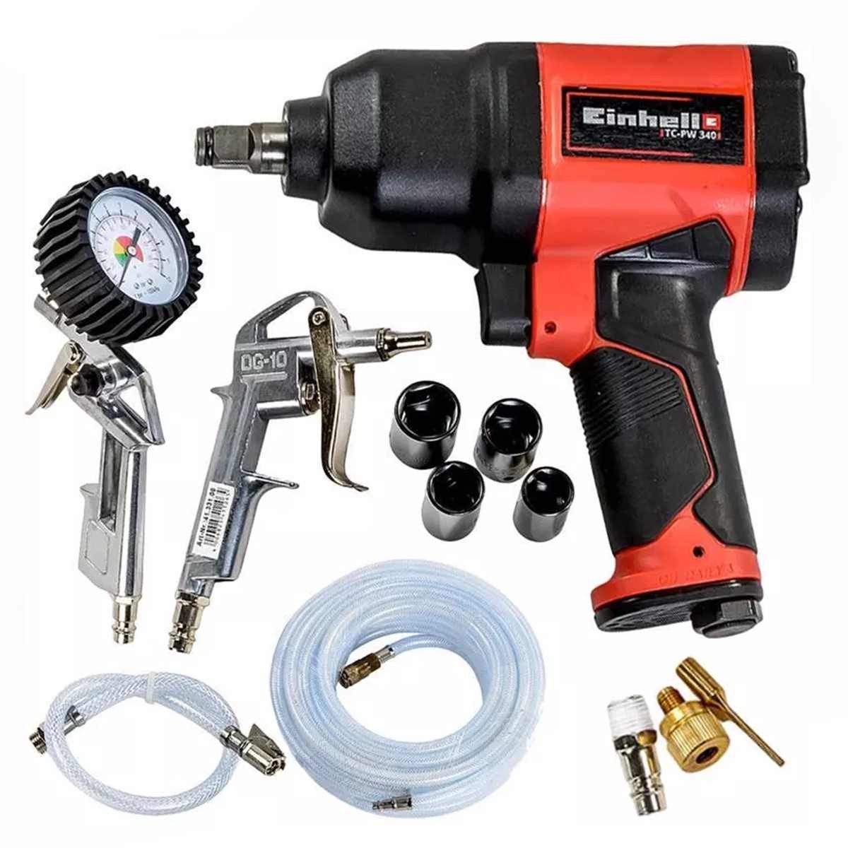 Original Einhell 10-tlg. Druckluftzubehörset (Kompressor-Zubehör, inkl. Druckluft-Schlagschrauber, Ausblaspistole, Reifenfüller, Druckluftschlauch & div. Adapter)