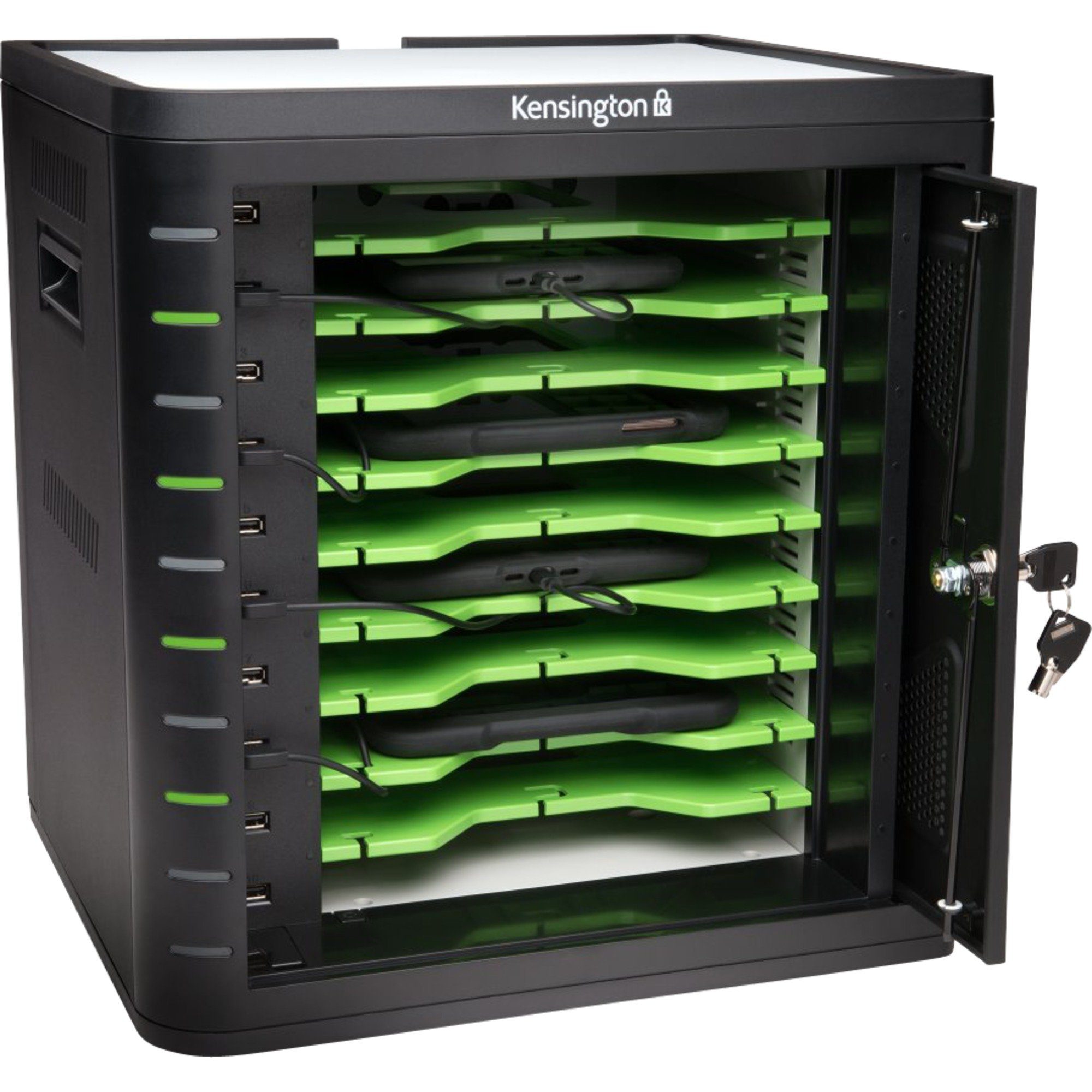 universal Das Kensington Lade- und Synchronisierungs-Kabinett für Tablets bietet eine praktische sichere Aufbewahrungsmöglichkeit für bis zu 10 Tablets (iPads, Galaxy Tabs, Kindles etc.). Das Lade- und Synchronisierungs-Kabinett für Tablets ist die perfekte Lösung zum Laden von Tablets am Ende des Tages, damit sie am nächsten Morgen wieder voll aufgeladen zur Verfügung stehen. Dank anpassbarer Auszüge finden Tablets zudem auch in einem robusten Schutzcase Platz. Man kann bis zu drei Kabinetts übereinander stellen und hat so Platz für bis zu 30 Tablets. Die manipulationssichere, versenkbare Tür bietet Schutz durch ein individuelles Schließsystem, und mit der im Lieferumfang enthaltenen Befestigungsplatte oder einem Kabelschloß wird das Kabinett gesichert.