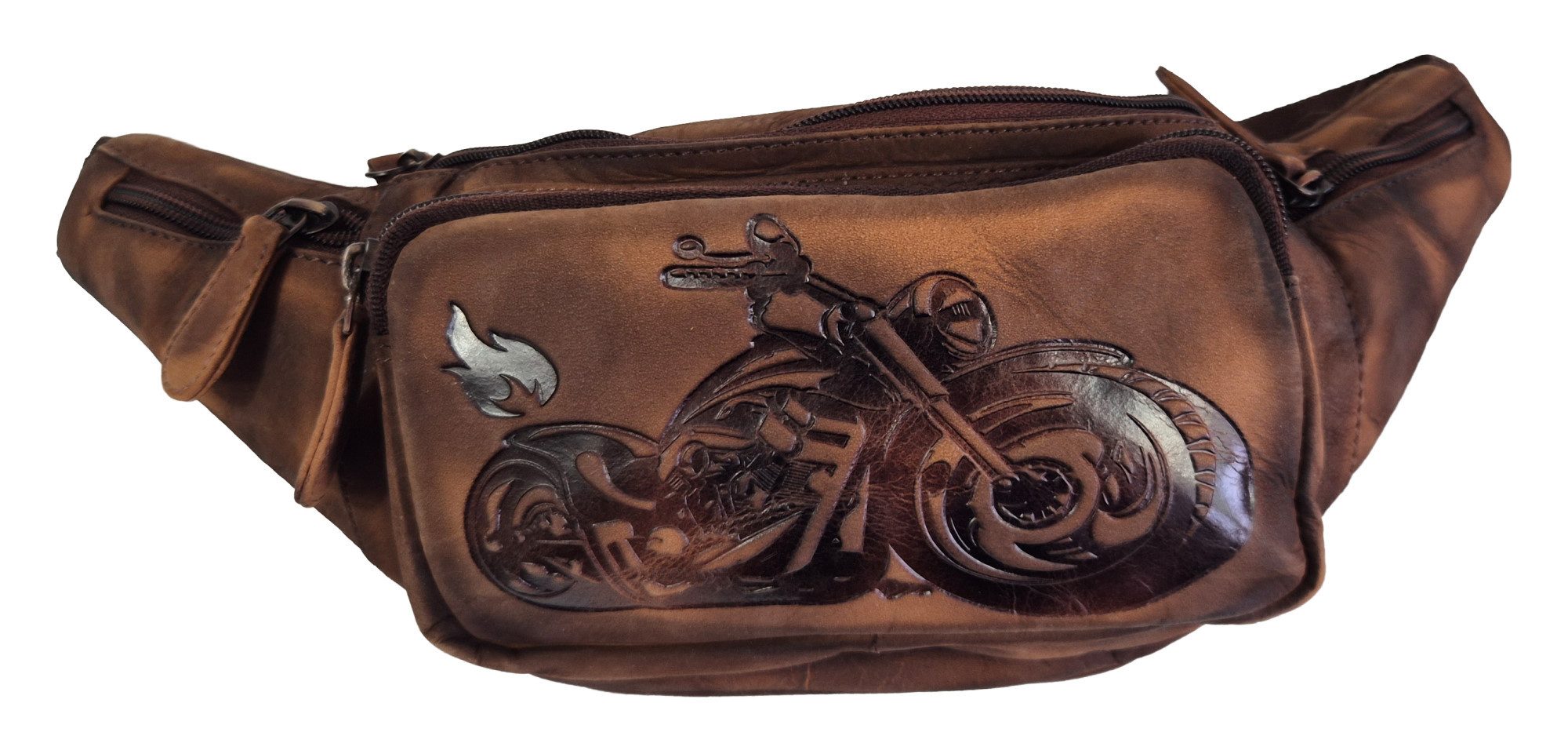 Eine rustikale Bauchtasche aus echtem Leder mit dem Design eines Motorrads eingeprägt. In einem rustikalen Look. Wenn Sie diese Gürteltasche in der Farbe braun tragen, wird jedermann erkennen: Sie sind ein Mann oder eine Frau von Welt. Diese Tasche ist aus festem und sehr gutem Büffel-Leder gefertigt. Sie werden doch nicht mit diesen billigen Plastiktaschen auf Reisen gehen, die jeder Taschendieb mit der Rasierklinge hinten kinderleicht durchschneiden kann. Aber nicht doch. Sie gehen mit einer Bauchtasche aus echtem Leder. Diese ist sicher und sieht sehr gut aus. Neben dem Hauptfach gibt es noch ein Seitenfach vorne und ein Fach hinten, das beim Tragen um den Bauch versteckt ist. Und an den beiden Seiten sind nochmals 2 Reißverschlusstaschen, ideal für Kleingeld. Die Innenausstattung ist aus festem Stoff. Sehr interessant ist der praktische Verschluss-Riegel als Schnappverschluss. Durch diesen können Sie die Tasche mit einem Griff umbinden und wieder lösen. Dafür muss man gleichzeitig die beiden Verriegelungen drücken. Pech gehabt, Taschendieb. Diese Tasche kann man nicht einfach so im Vorbeigehen mitnehmen. Die Размер beträgt in der Mitte 20x14 cm und insgesamt mit den Seitentaschen 38x14 cm. Der Gurt ist bis 130 cm verstellbar. Wenn Sie diese Tasche tragen, wird jedermann Sie darum beneiden. Diese edle Bauchtasche wurde in liebevoller Handarbeit gefertigt. Das hier verwendete Leder ist einmalig und nicht zu kopieren. Kein Stück gleicht dem anderen. Kleine natürliche Hautmarkierungen oder geringe farbliche Schattierungen sind keine Qualitätsmängel, sondern unterstreichen die Echtheit des beliebten Naturproduktes LEDER.