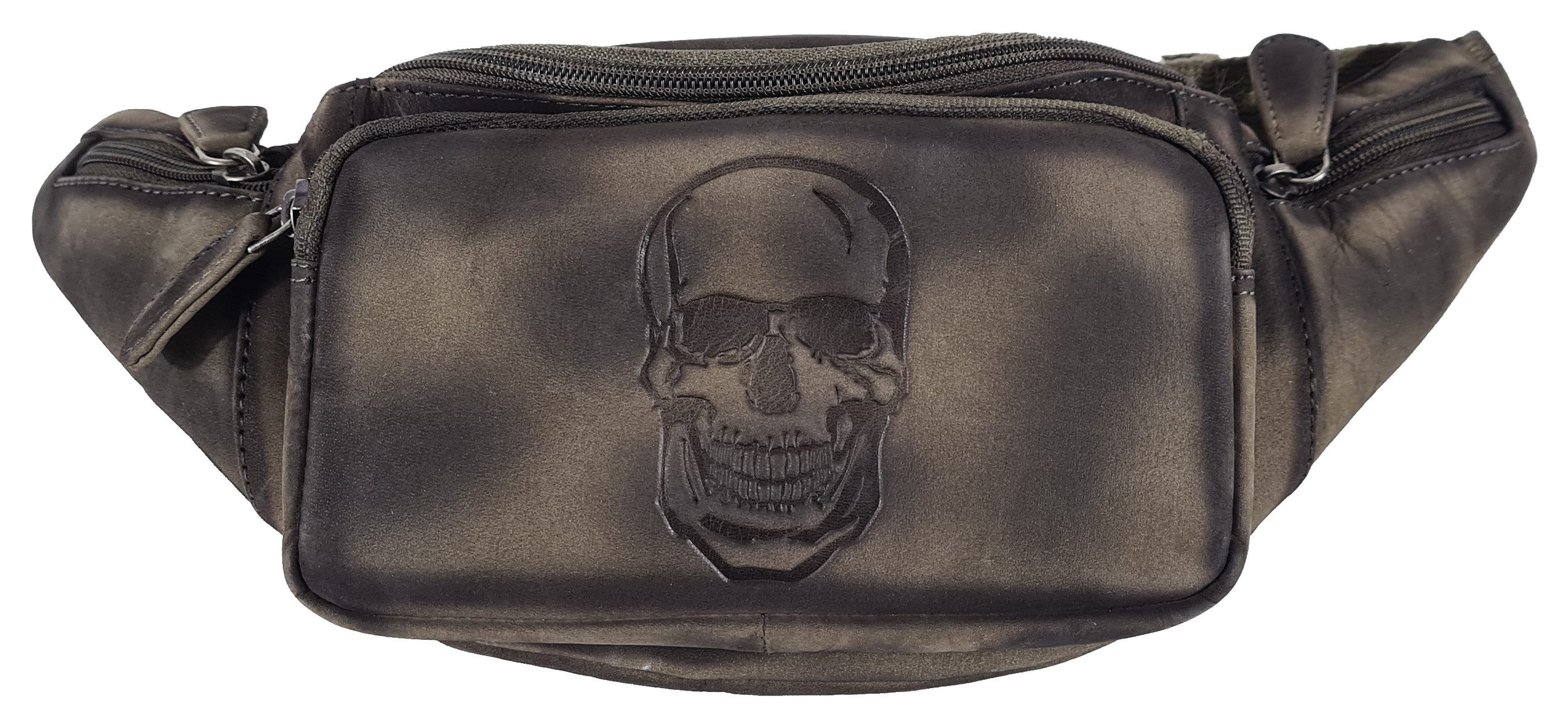 Eine rustikale Bauchtasche aus echtem Leder mit dem Design eines Totenkopfes eingeprägt. In einem rustikalen Look. Diese Tasche ist aus festem und sehr gutem Büffel-Leder gefertigt. Sie werden doch nicht mit diesen billigen Plastiktaschen auf Reisen gehen, die jeder Taschendieb mit der Rasierklinge hinten kinderleicht durchschneiden kann. Aber nicht doch. Sie gehen mit einer Bauchtasche aus echtem Leder. Diese ist sicher und sieht sehr gut aus. Neben dem Hauptfach gibt es noch ein Seitenfach vorne und ein Fach hinten, das beim Tragen um den Bauch versteckt ist. Und an den beiden Seiten sind nochmals 2 Reißverschlusstaschen, ideal für Kleingeld. Die Innenausstattung ist aus festem Stoff. Sehr interessant ist der praktische Verschluss-Riegel als Schnappverschluss. Durch diesen können Sie die Tasche mit einem Griff umbinden und wieder lösen. Dafür muss man gleichzeitig die beiden Verriegelungen drücken. Pech gehabt, Taschendieb. Diese Tasche kann man nicht einfach so im Vorbeigehen mitnehmen. Die Размер beträgt in der Mitte 20x14 cm und insgesamt mit den Seitentaschen 38x14 cm. Material: 100% Rindsleder (Taurinus). Wenn Sie diese Tasche tragen, wird jedermann Sie darum beneiden. Perfekt für jeden Motorradfahrer. Diese edle Bauchtasche wurde in liebevoller Handarbeit gefertigt. Das hier verwendete Leder ist einmalig und nicht zu kopieren. Kein Stück gleicht dem anderen. Kleine natürliche Hautmarkierungen oder geringe farbliche Schattierungen sind keine Qualitätsmängel, sondern unterstreichen die Echtheit des beliebten Naturproduktes LEDER.